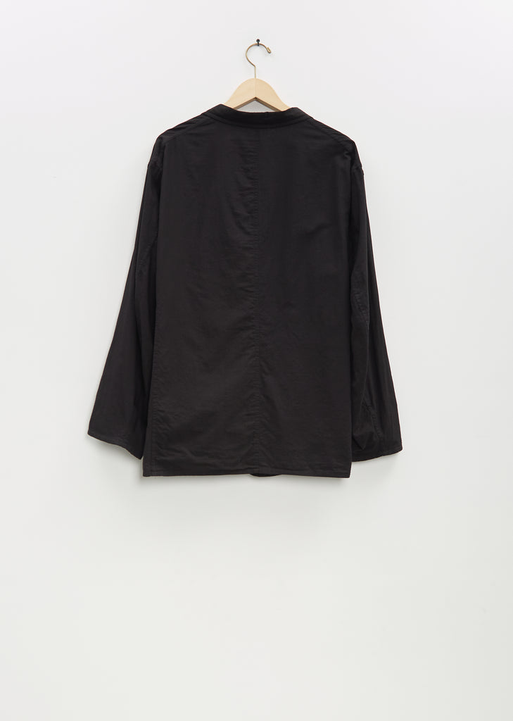 Comoli black single breasted jacket with a notched collar and two black horn-hued button front closure in double layered cotton khadi. Features dropped shoulders and front patch pockets. Lined in self.