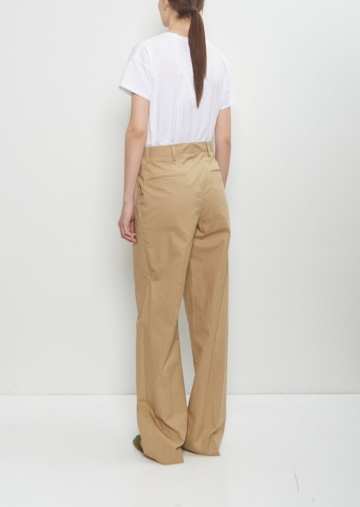 Dries Van Noten dark beige tailored pants with wide, straight legs in crisp cotton. Features front pleats, belt loops, side seam pockets, back welt pockets, and a button, hook and eye, zip-fly fastening.