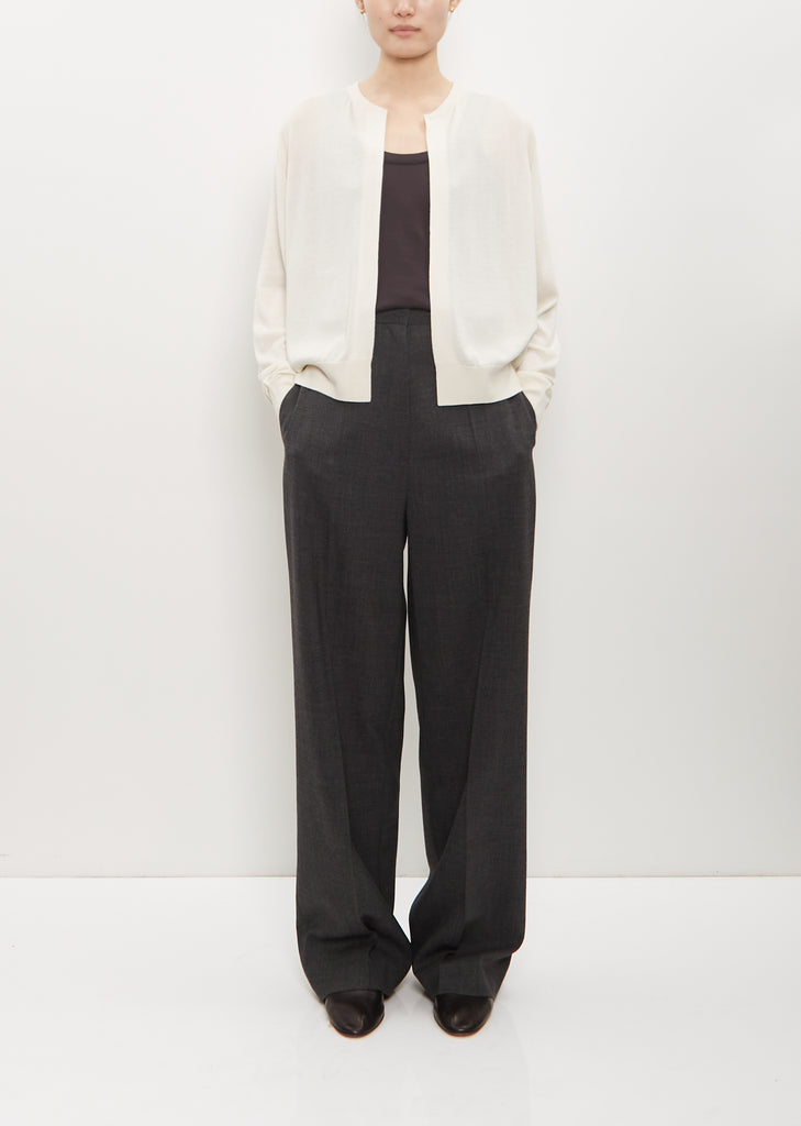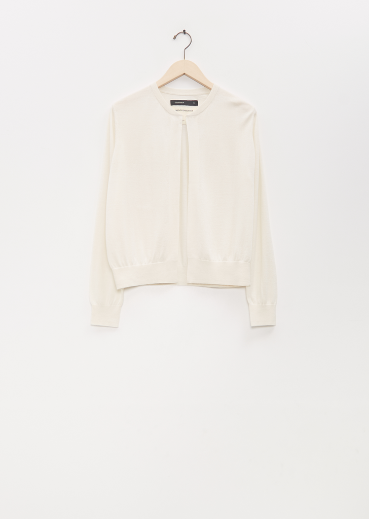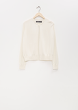 Frenckenberger white slightly cropped open cardigan with raglan sleeves in a lightweight silk and cashmere blend knit. Features a rib trim finish at neck, cuffs and hem. Relaxed fit.