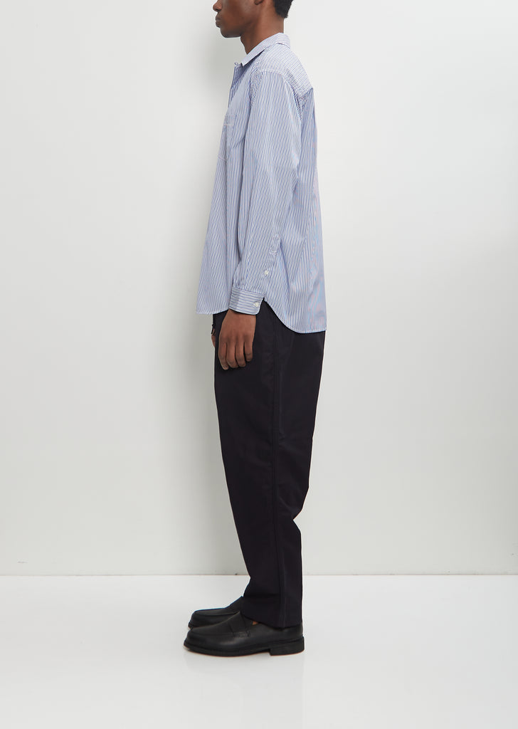 Comme des Garçons Homme navy, sax, and white striped button up shirt with a classic collar and button loop fastening at neck in cotton poplin. Features chest patch pocket, buttoned cuffs, slightly curved hem, and two box pleats at back yoke. Finished with branded shell-hued buttons throughout.