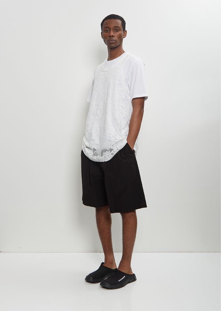 Comme des Garçons Homme Plus off white jersey with a scoop neckline in a semi sheer polyester floral lace fabric. Relaxed fit.