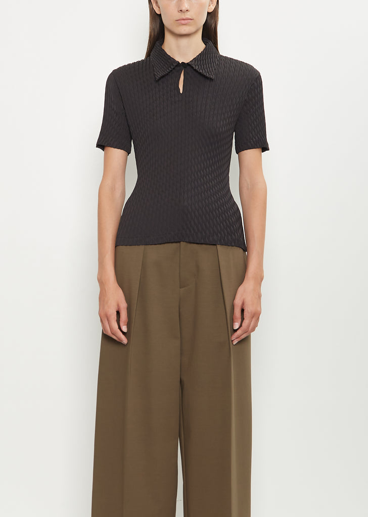 Issey Miyake black short sleeve shirt with a pointed collar and single button keyhole closure at neck in twice pleated glossy polyester. Closer fit.