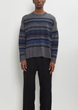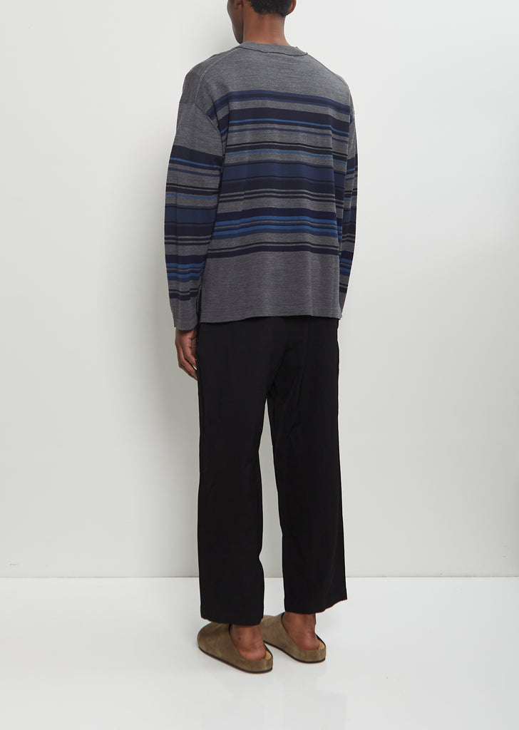 Junya Watanabe MAN navy and grey striped sweater with a round neckline in worsted wool. Features dropped shoulders, split side hems, elongated back hem, and ribbed trim finish at neckline.