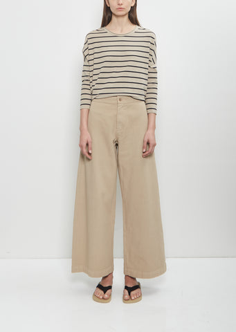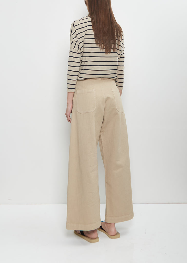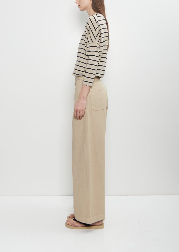 Labo.art beige straight wide leg trouser with button and zip-fly closure in soft Italian cotton drill. Features side seam pockets and patch pockets at back.