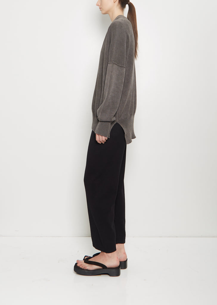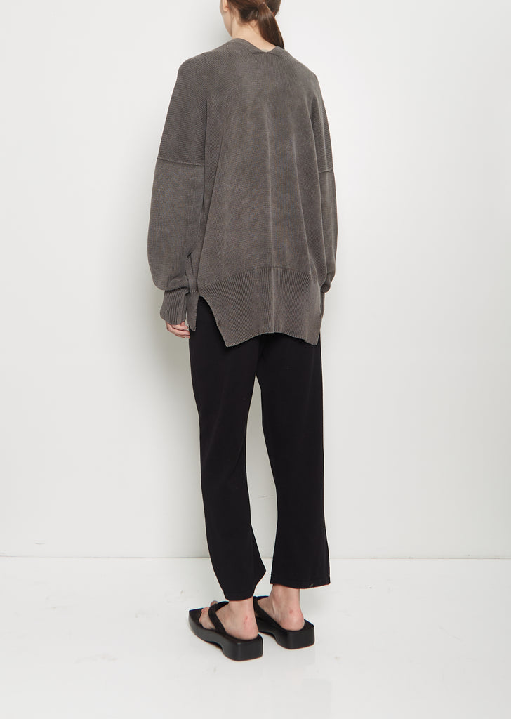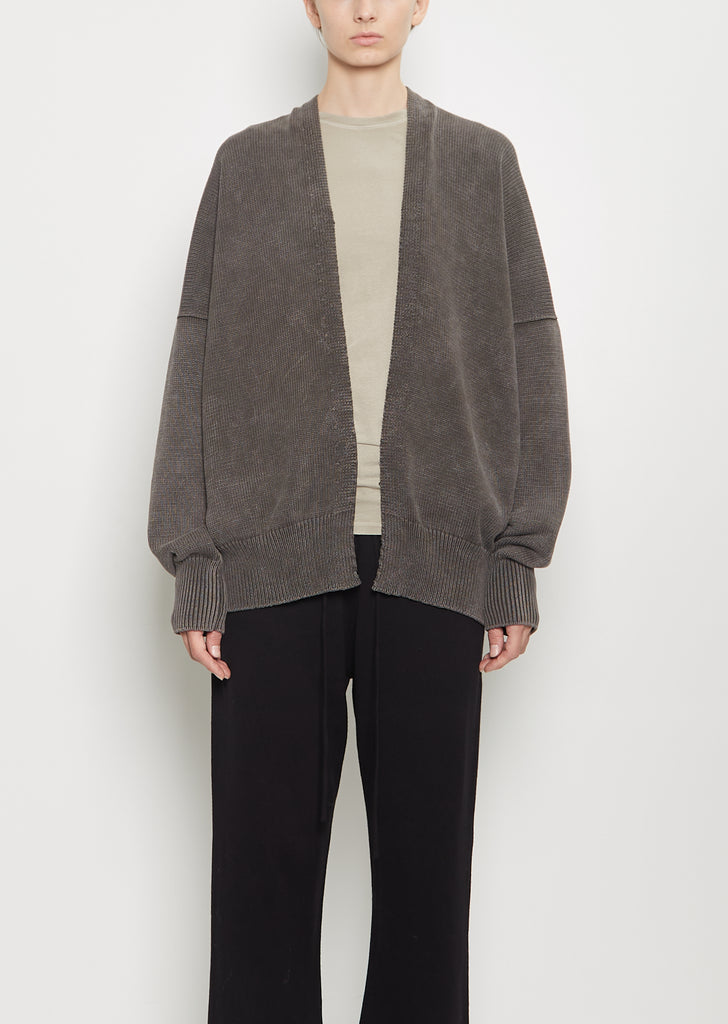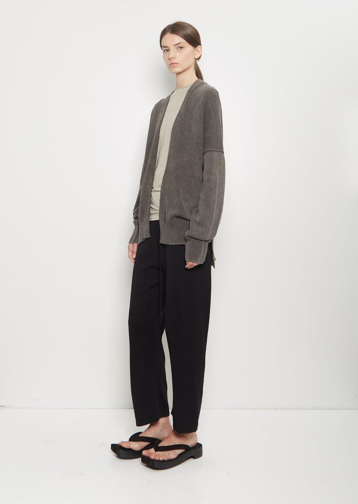 Lauren Manoogian washed ink grey open front cardigan in mid-weight organic cotton knit. Features dropped shoulders, split side hems, elongated back, small V-neckline at back, and ribbed trim finish at cuffs and hem.