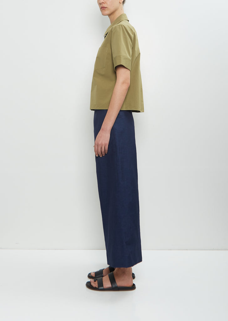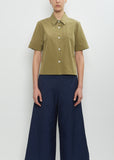 Margaret Howell warm olive cropped short sleeve shirt with a classic collar and mother-of-pearl button front in a lightweight cotton poplin. Features chest patch pocket, deep cuffs with split seam detail, split side hems, and box pleat at back yoke.