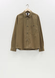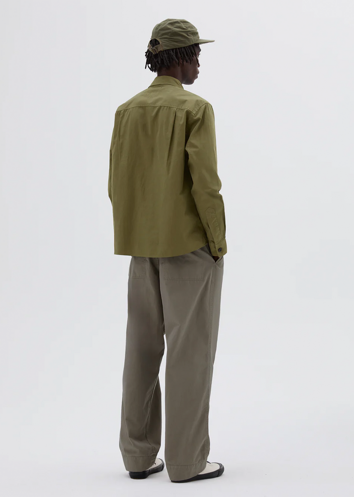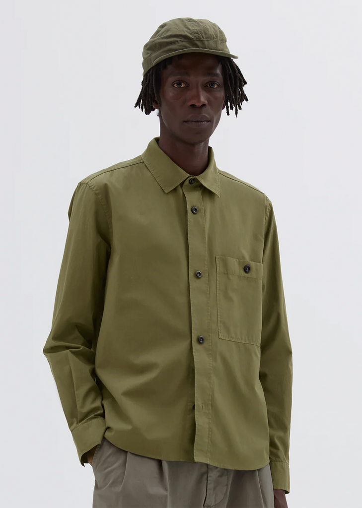 MHL by Margaret Howell khaki green shirt with a classic collar and raised placket in washed cotton poplin. Features dropped shoulders, buttoned chest patch pocket, buttoned cuffs, side gusset detailing, and two box pleats at back yoke. Relaxed, boxy cut.