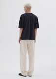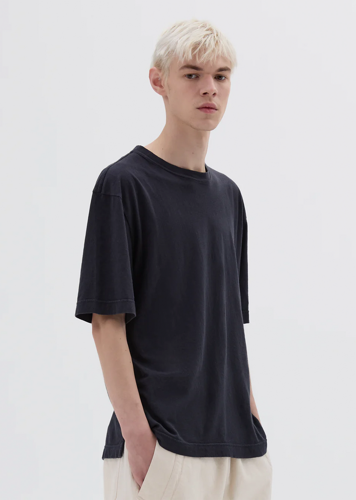 MHL by Margaret Howell navy crew neck t-shirt in a lightweight cotton linen jersey. Features side split hem. Boxy loose fit.
