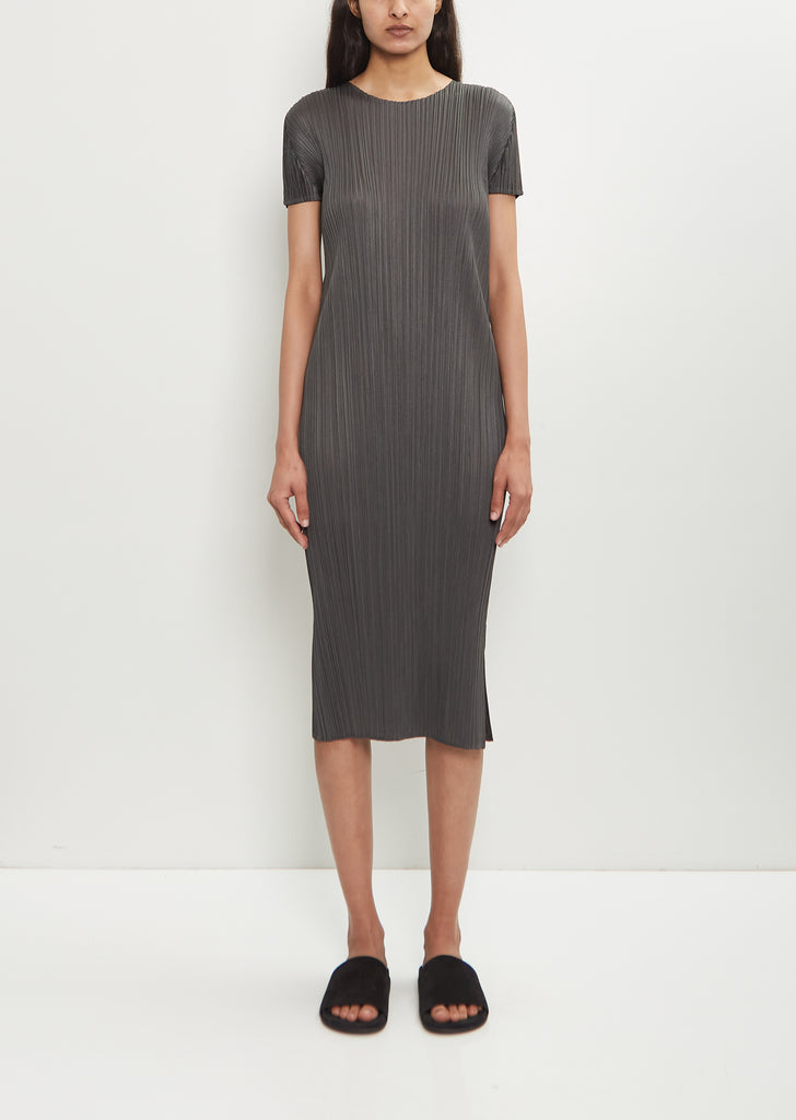 Pleats Please by Issey Miyake charcoal gray short sleeve dress with a round neckline and dropped shoulders in signature pleated technical chiffon. Closer fit.