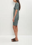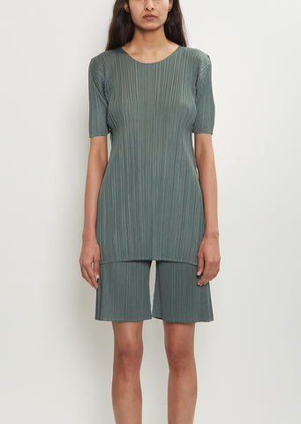 Pleats Please by Issey Miyake moss green short sleeved tunic with a round neckline in signature pleated chiffon fabric. Features a split side seam detail on left side.