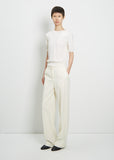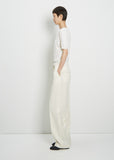 High-rise pleated pant in midweight textured wool with front and back pleating, and back besom pockets.