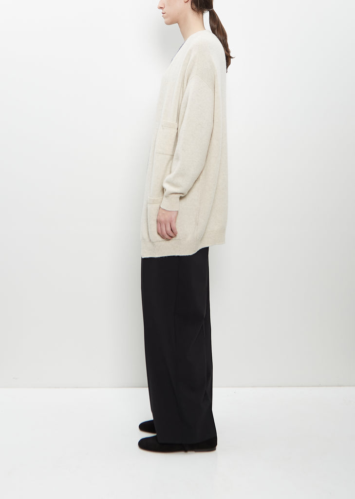 Begg x Co light beige open front cardigan with three front patch pockets in mid-weight cashmere knit. Features dropped shoulders and rib trim finishings at cuffs and hem. Relaxed fit.