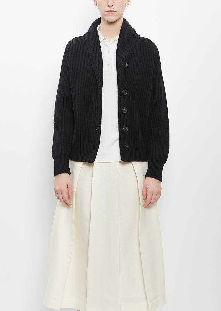 Begg x Co black yacht cardigan with a classic fisherman-style button front closure and shawl collar knitted in 3-ply cashmere. Features chunky ribbed design throughout and saddle shoulders. Finished with brown horn-hued buttons.