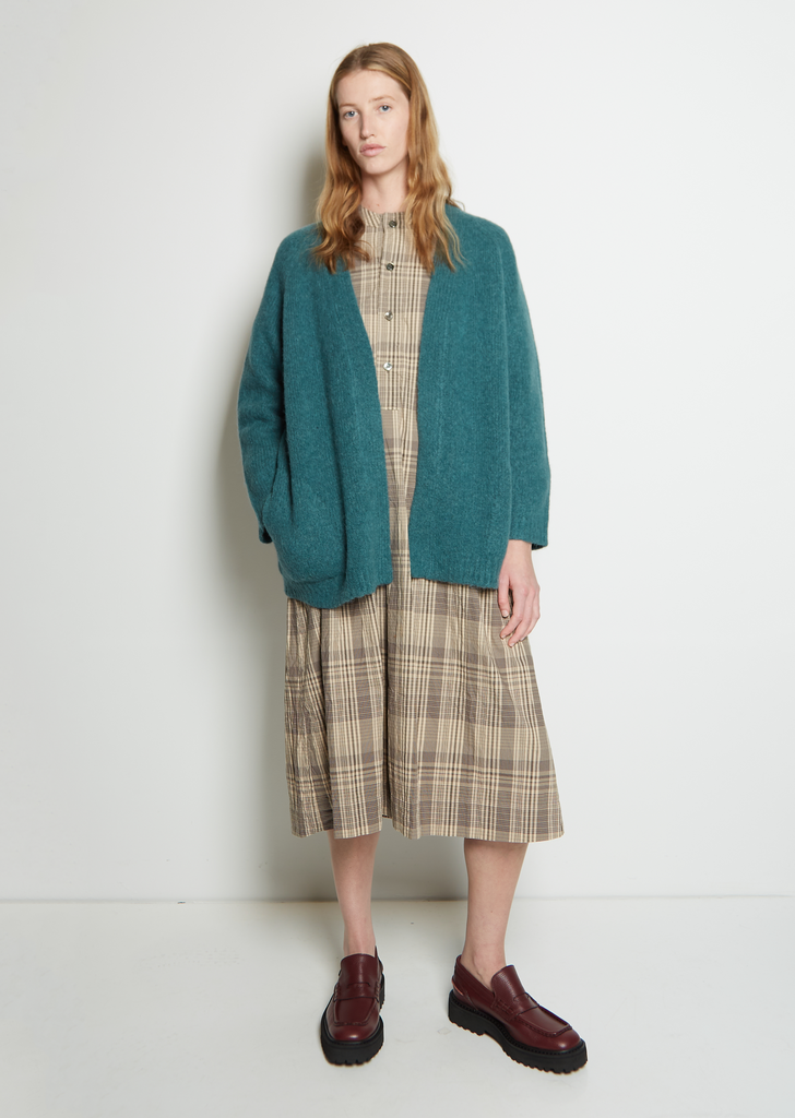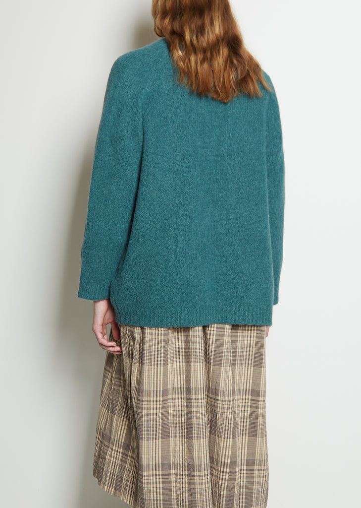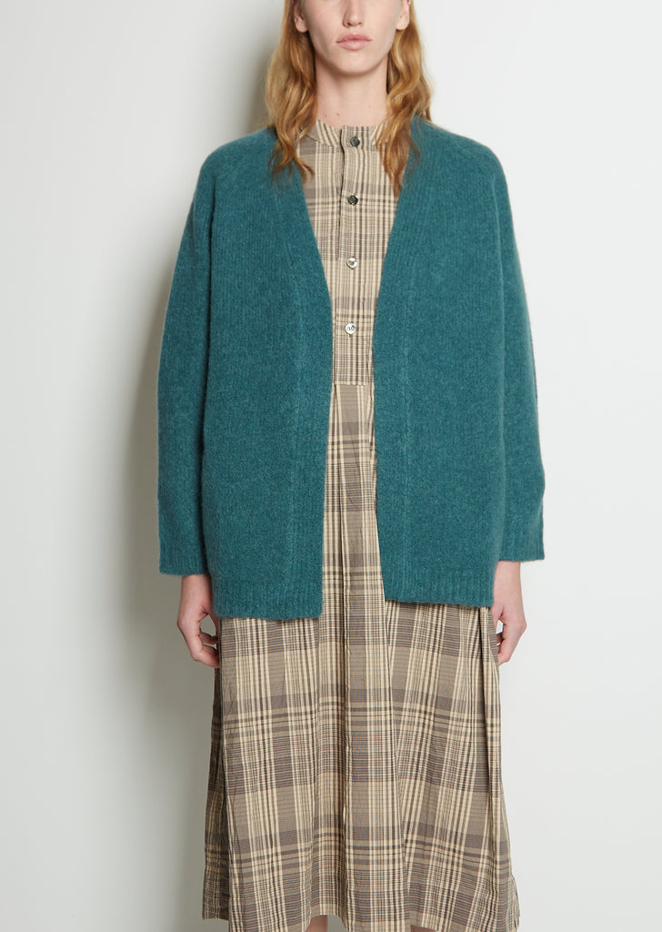 Véritécoeur moss green open cardigan with raglan sleeves in alpaca and wool blend shaggy knit. Features rib trim at sleeve cuffs and hem with hidden side pockets. Relaxed fit.