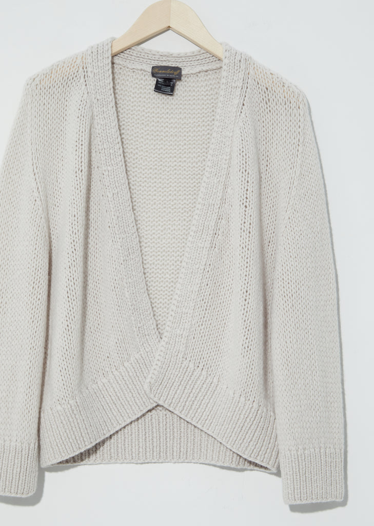 Wommelsdorff one-of-a-kind open cardigan in putty, hand knitted in Berlin from the finest cashmere yarns. Finished with a 2-ply rib at neckline, sleeve cuffs and hem.