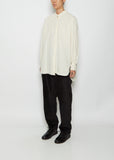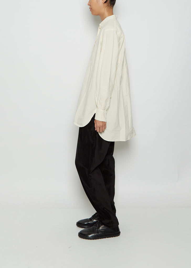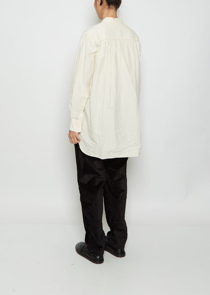 Casey Casey natural-toned button-down band collared shirt with a rounded, high-low shirt hem and gathered back yoke in a raw, untreated washed cotton.