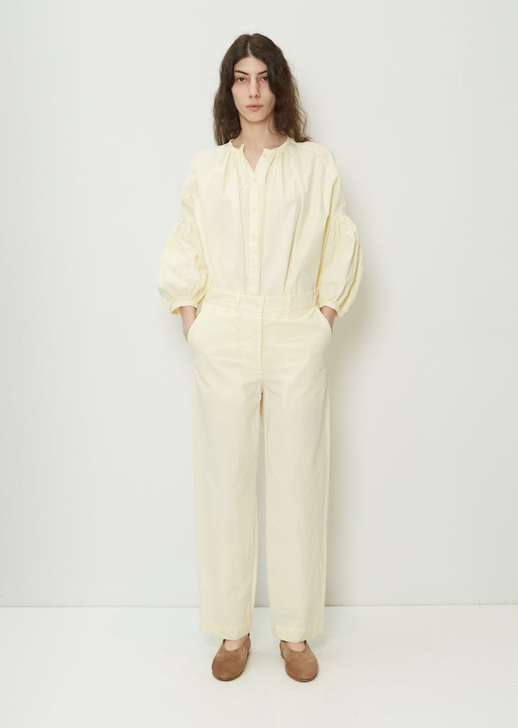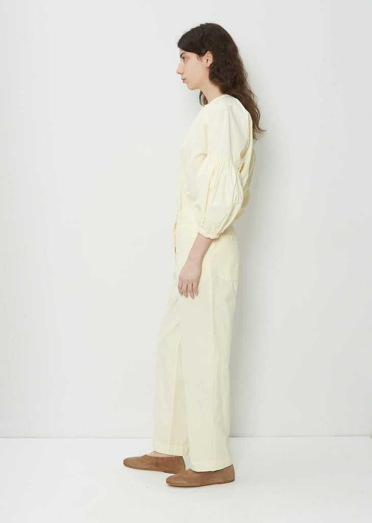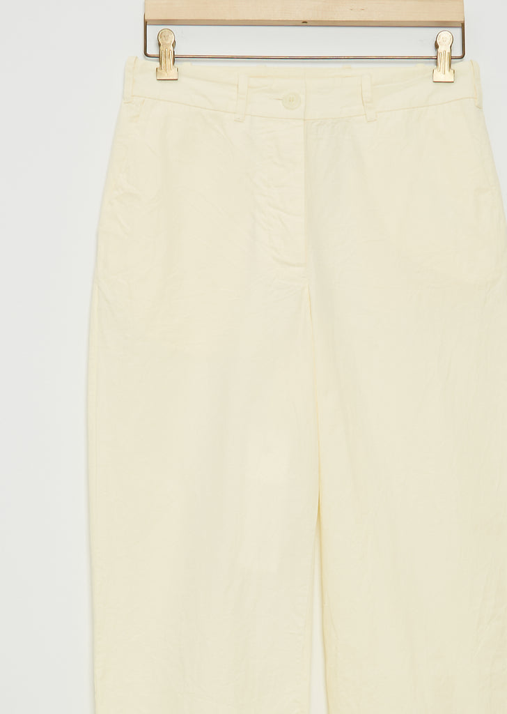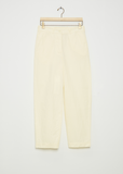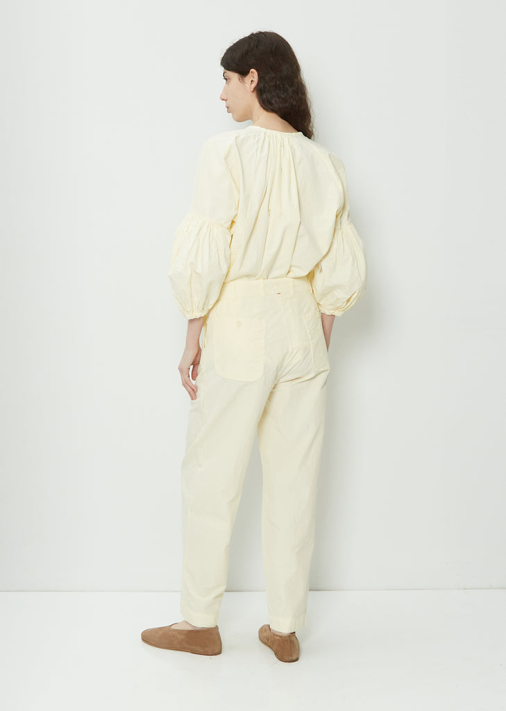Casey Casey porcelain tapered leg chino pant in paper cotton. Features a button fly closure, slash pockets, and 2 back patch pockets with button closure.