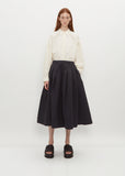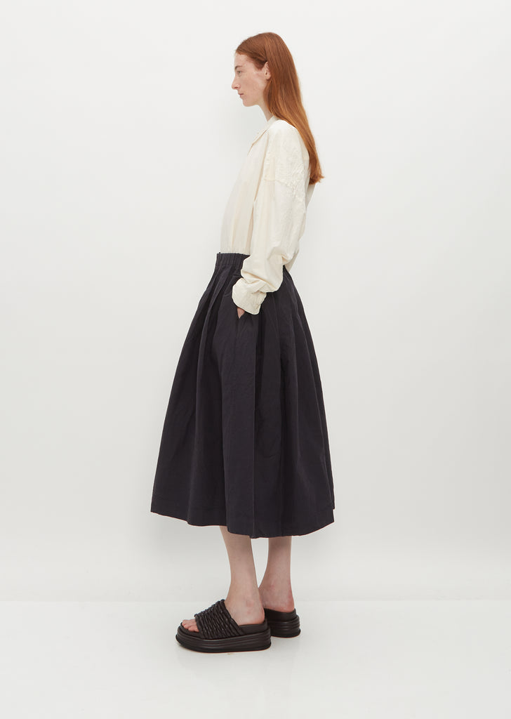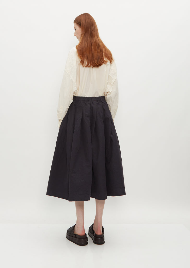 Casey Casey black mid length A-line skirt with box pleats in cotton with a double washed finish. Features concealed side seam pockets and an elasticized waist with an interior drawcord.