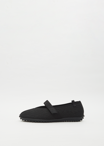 Cecilie Bahnsen black ballerina crafted using the matelassé  technique to create the sculptural design. Features a round toe, a fabric insole, velcro fastener and rubber soles for durability.