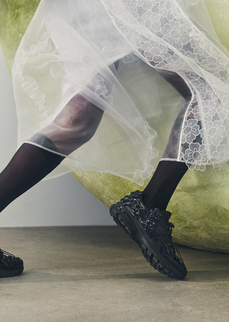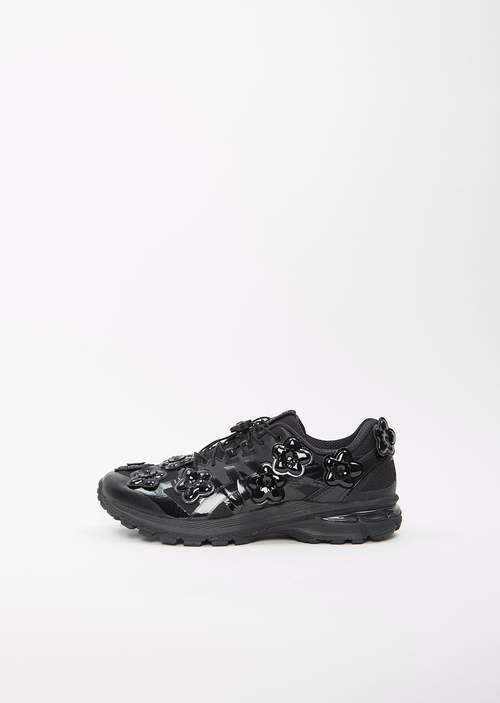 Cecilie Bahnsen x Asics GEL-Terrain black sneaker with padded glossy flower appliqués and glossy stripes along side panels in ripstop mesh. Features a round toe, a tonal FLYTEFOAM™ midsole, technical welding, no-sew elements and treaded rubber sole with a lightweight gel heel. Finished with a tonal lace closure detailed with a floral motif.