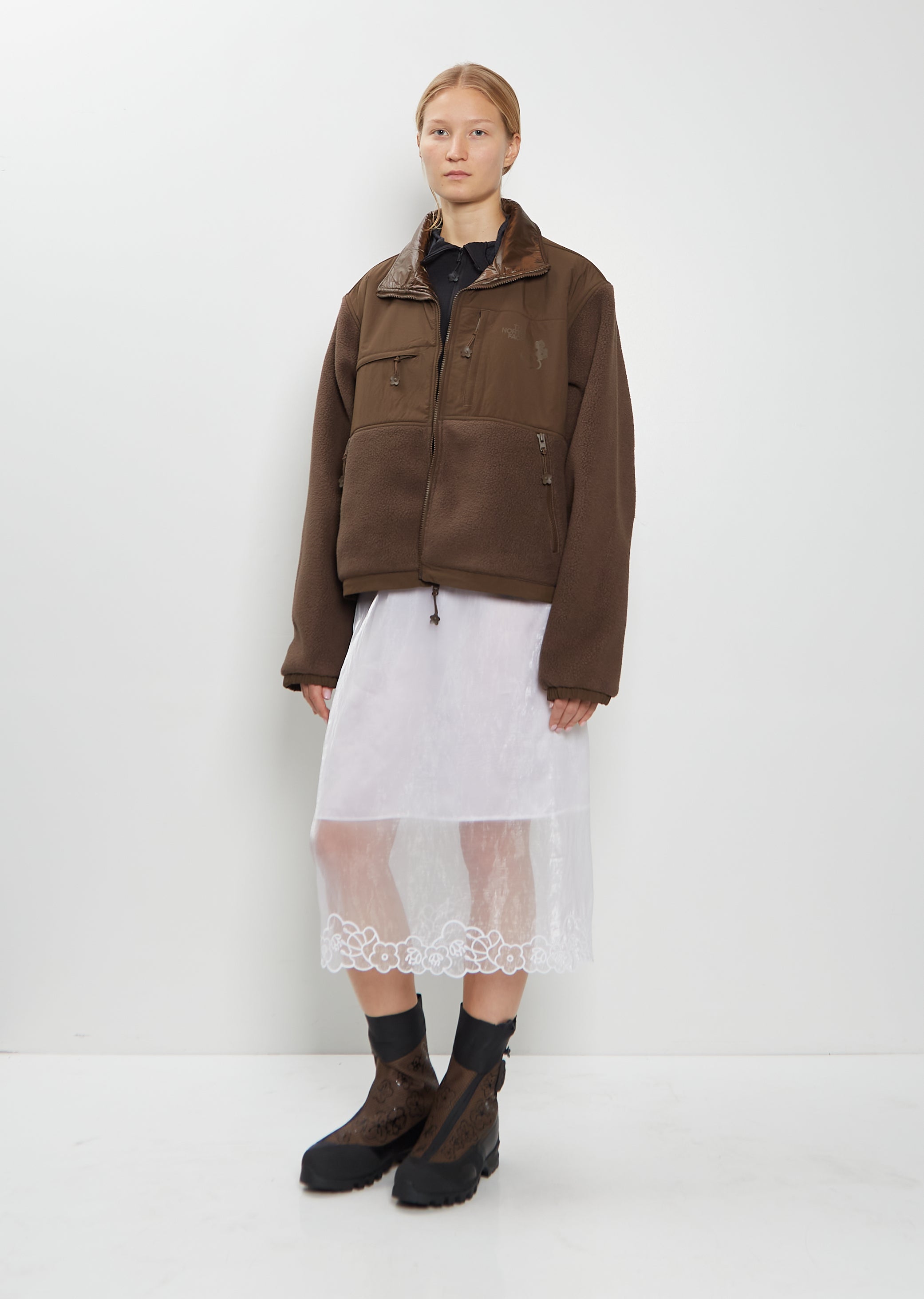 Cecilie Bahnsen in collaboration with The North Face brown unisex technical mountain boot with BOA® Fit System for a personalized adjustability in IBQ Dyneema® ultra-high tenacity ripstop with floral detailing. Features a round toe, velcro fastening tab at opening, a waterproof zipper closure, waterproof GORE-TEX® membranes, and high-traction Vibram® rubber outsole.