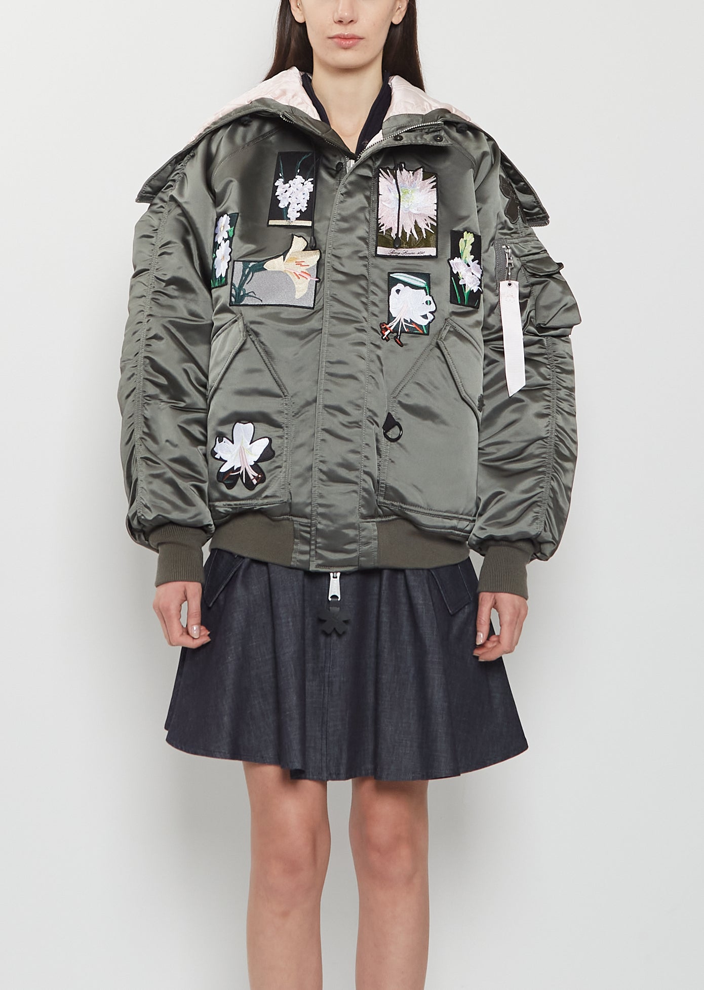 Cecilie Bahnsen in collaboration with Alpha Industries khaki green jacket with hand-tinted botanical illustrations patches and laser‑cut floral appliqués crafted in technical nylon. Features a sculptural zippered hood, dropped shoulders, a zippered pocket and flap pocket at left arm, flap buttoned pockets at waist, a concealed placket with magnetic press buttons, and an oversized two-way silver-hued zipper closure. Finished with a ribbed trim at cuffs and hem. Comes lined in a smooth quilted silk.