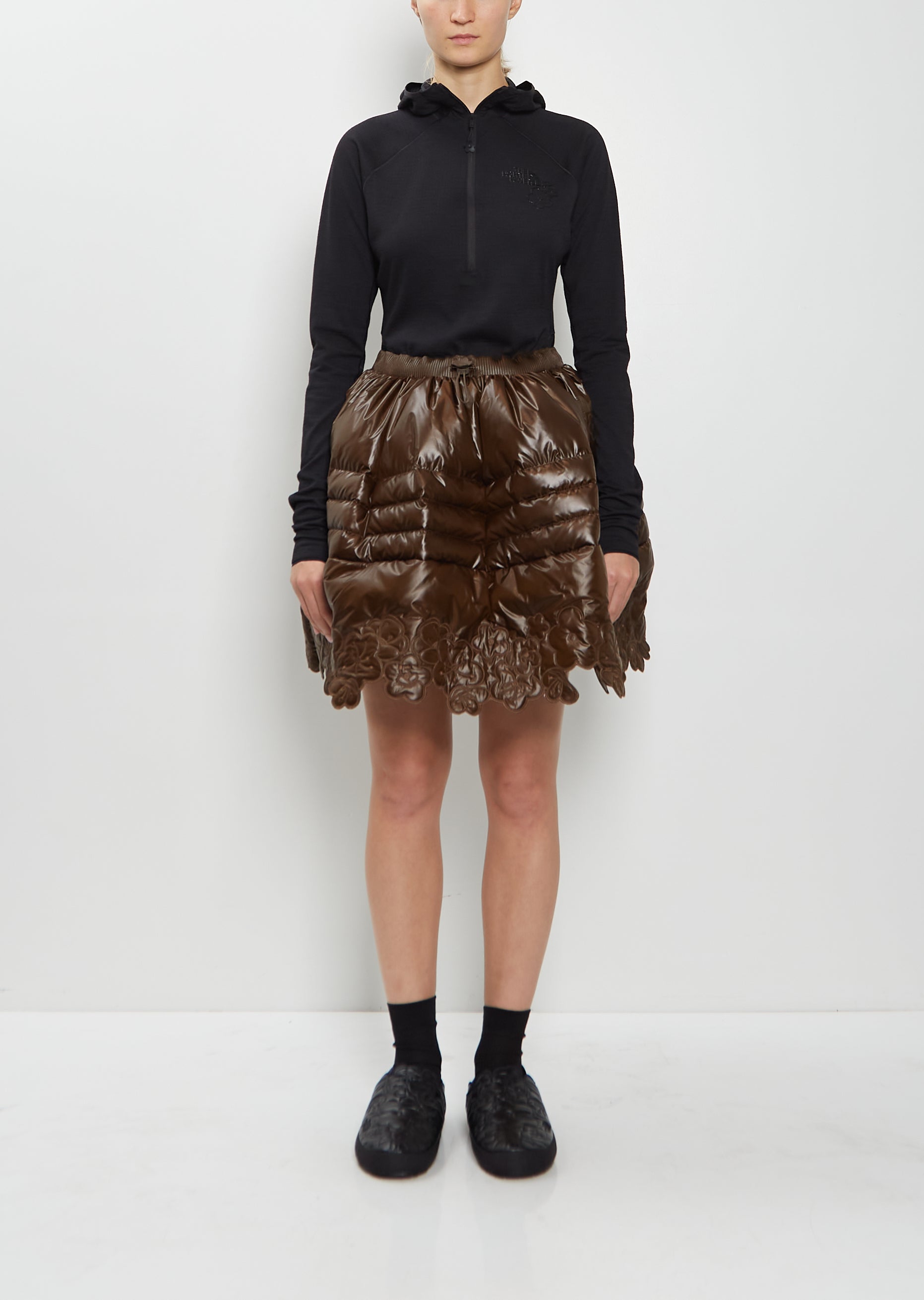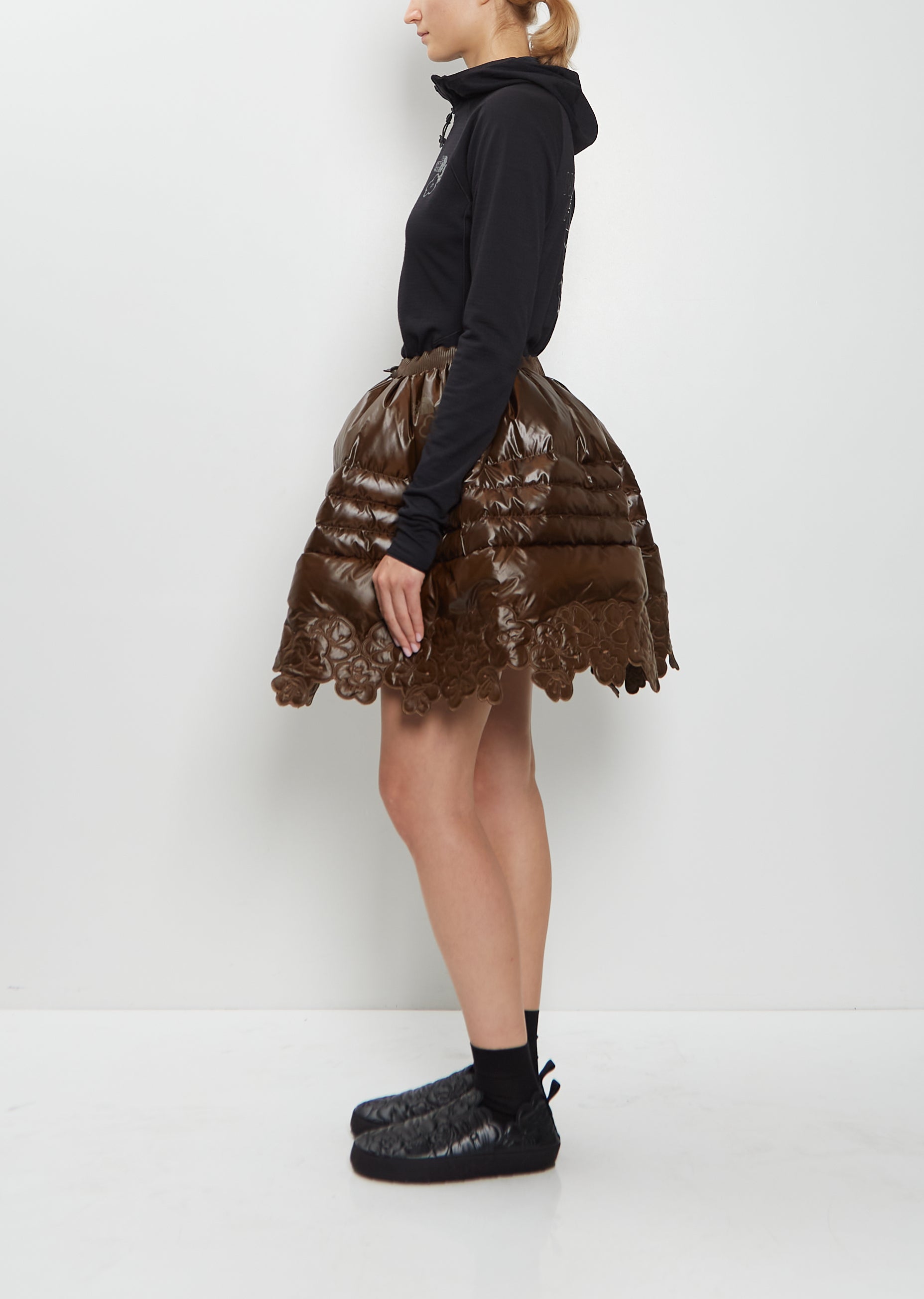 Cecilie Bahnsen in collaboration with The North Face brown padded pull-on skirt with ultra-warm 800-fill down insulation in water-repellent ripstop. Features an elasticated adjustable waist with floral detail toggle, angled pockets at sides and a floral trim at hem. Lined in tonal nylon.