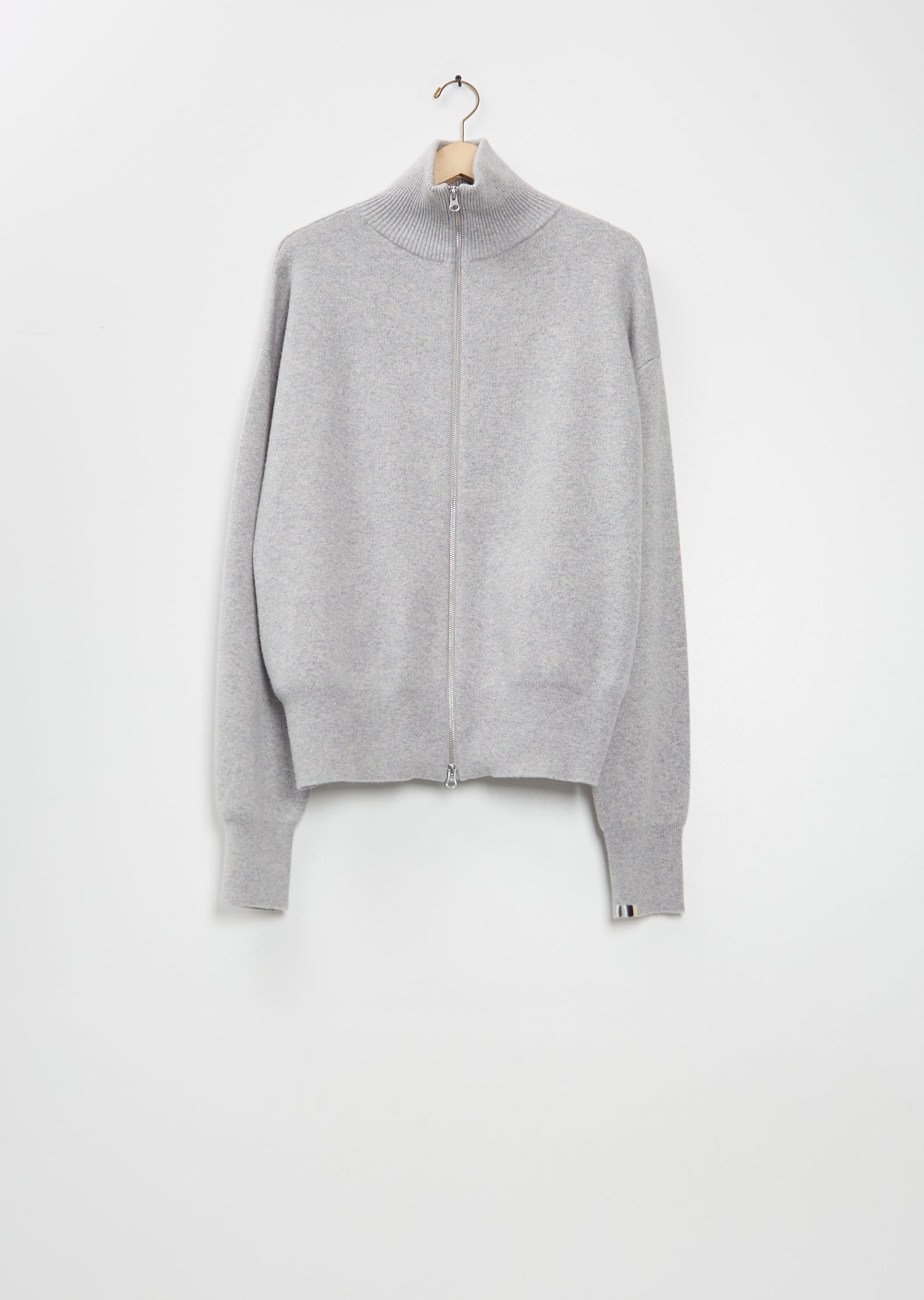 Extreme Cashmere grey two-way zip-up cardigan knitted in a tight gauge double-knit cashmere knit. Features drop shoulders, side pockets, and rib trim finish at neckline, cuffs, and hem. Boxy silhouette with an oversized fit.