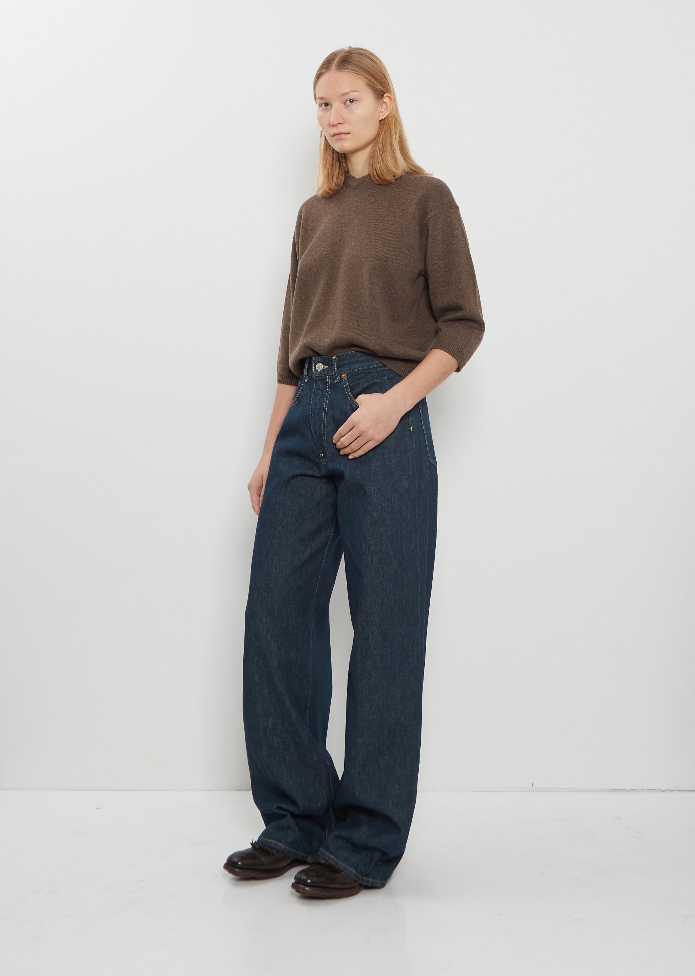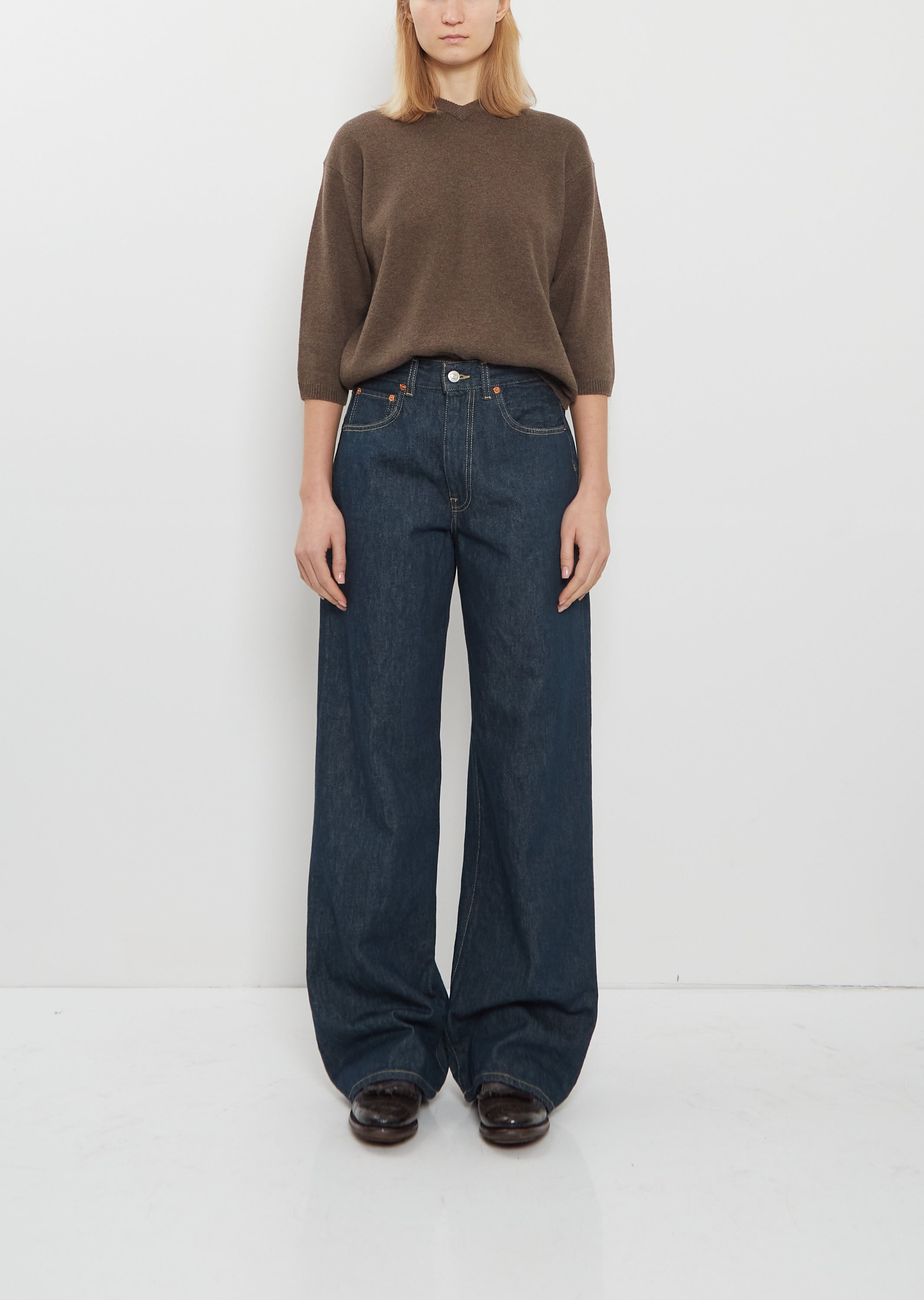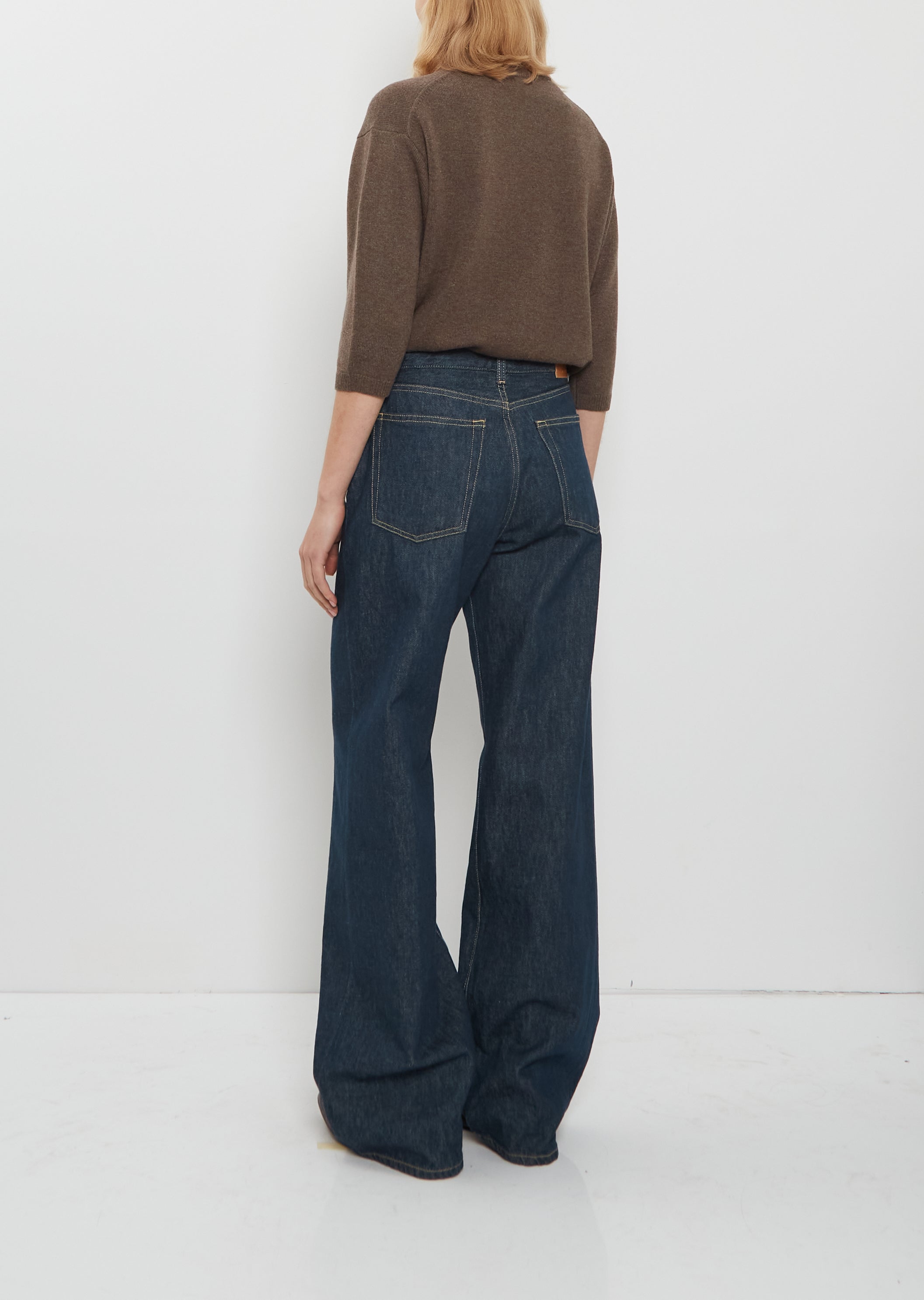 6397 raw rinsed indigo mid-rise jean with wide legs and 5-pocket styling in crisp rinsed cotton. Features belt loops, silver and copper toned hardware, and concealed zip with button at top.