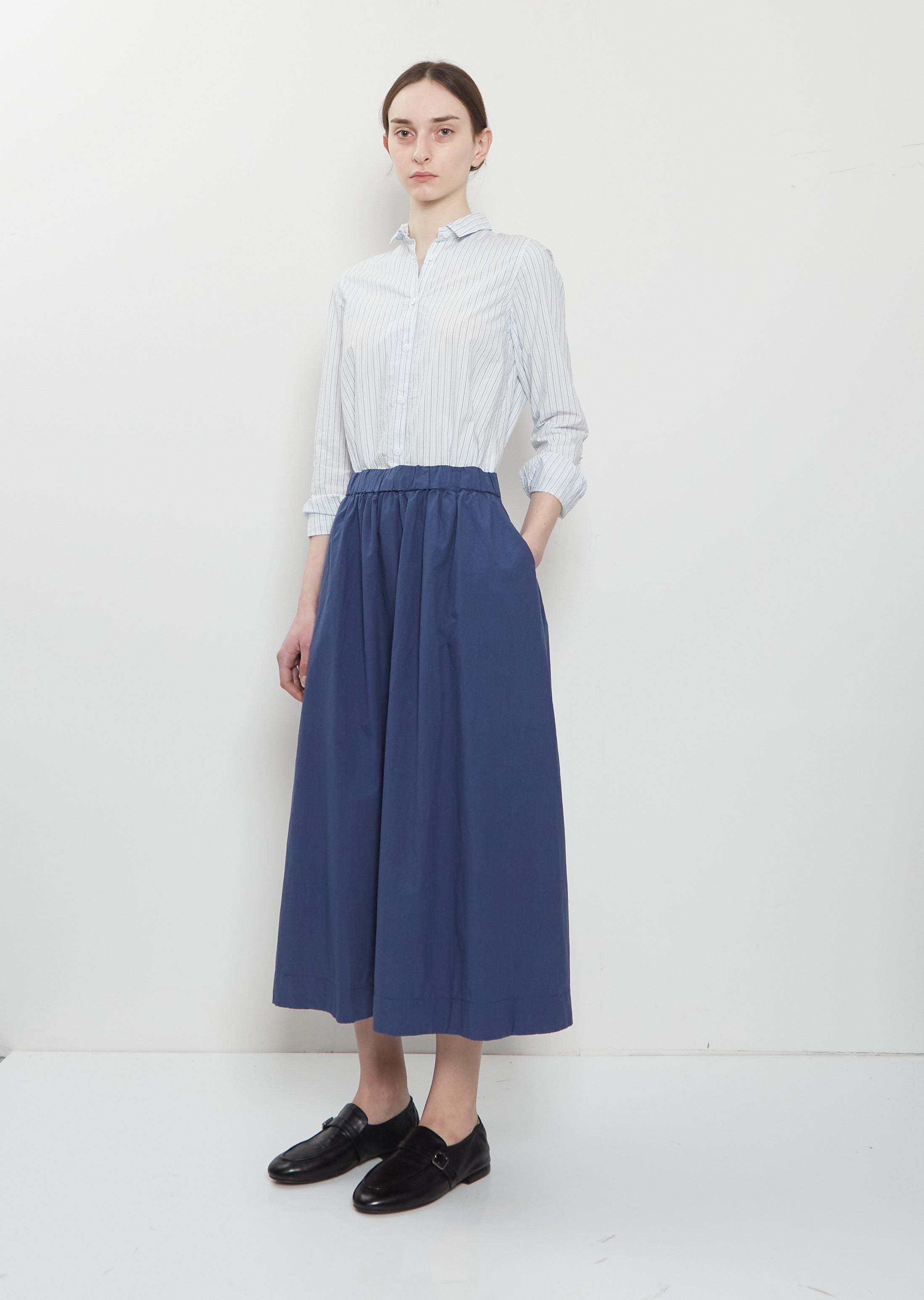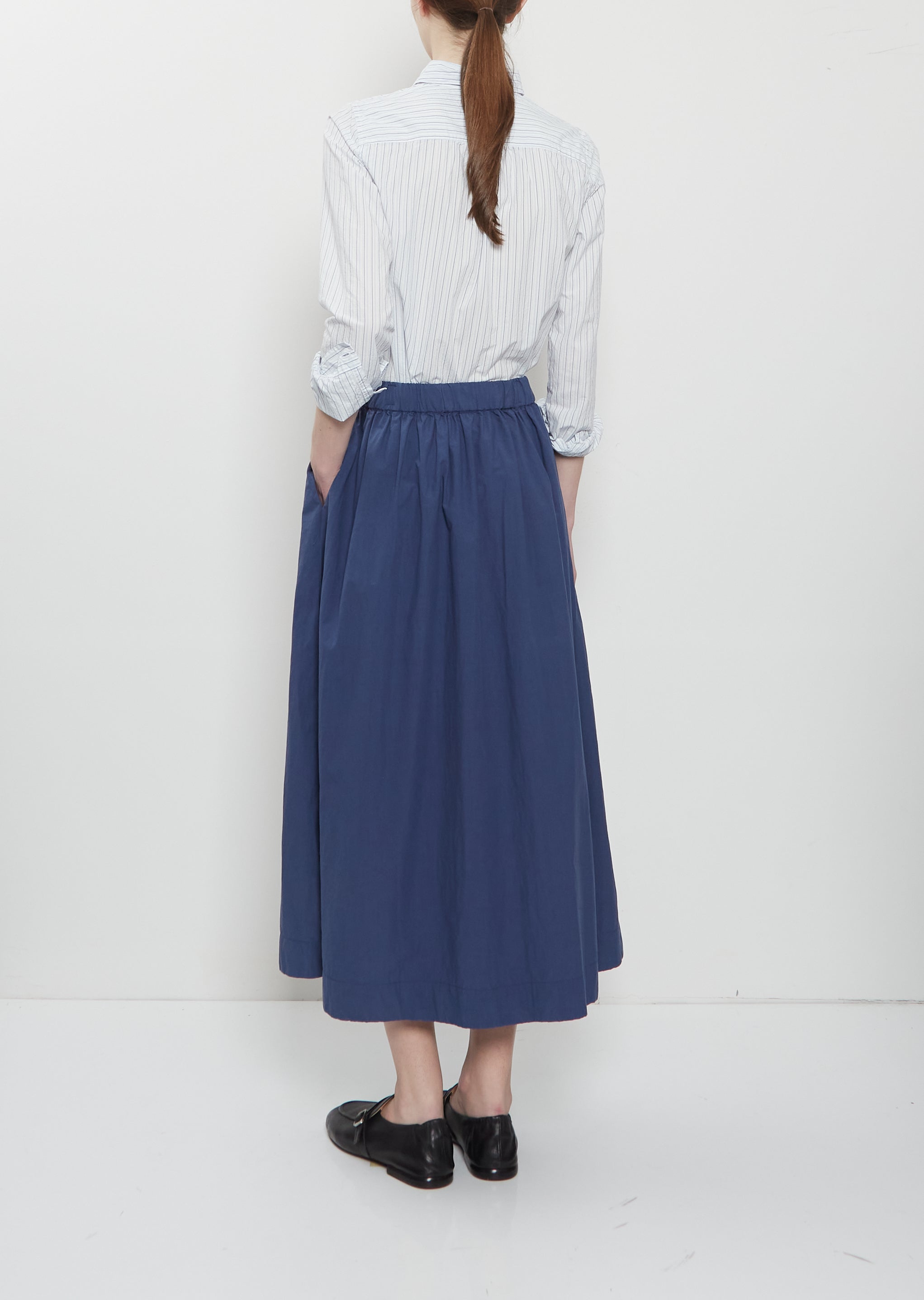 La Garçonne Exclusive — Bergfabel blue A-line skirt with elasticated gathered waist and angled pockets in soft and crisp cotton poplin. Relaxed fit.