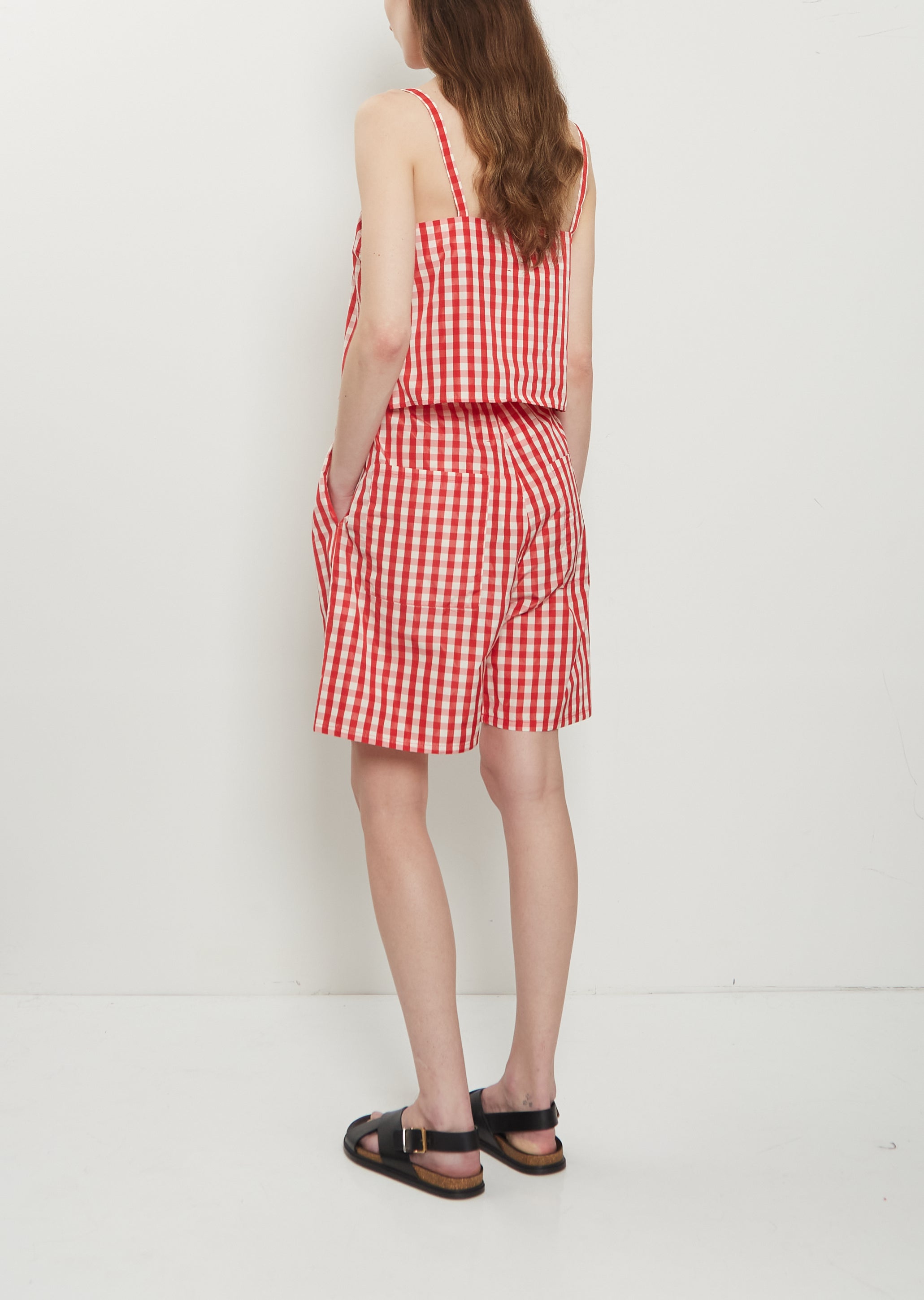 Eleph red and white gingham pull-on shorts with an elasticated waistband in crisp taffeta. Features two side seam pockets and two back patch pockets. Relaxed fit.