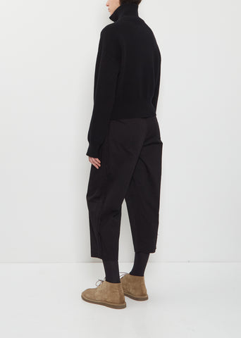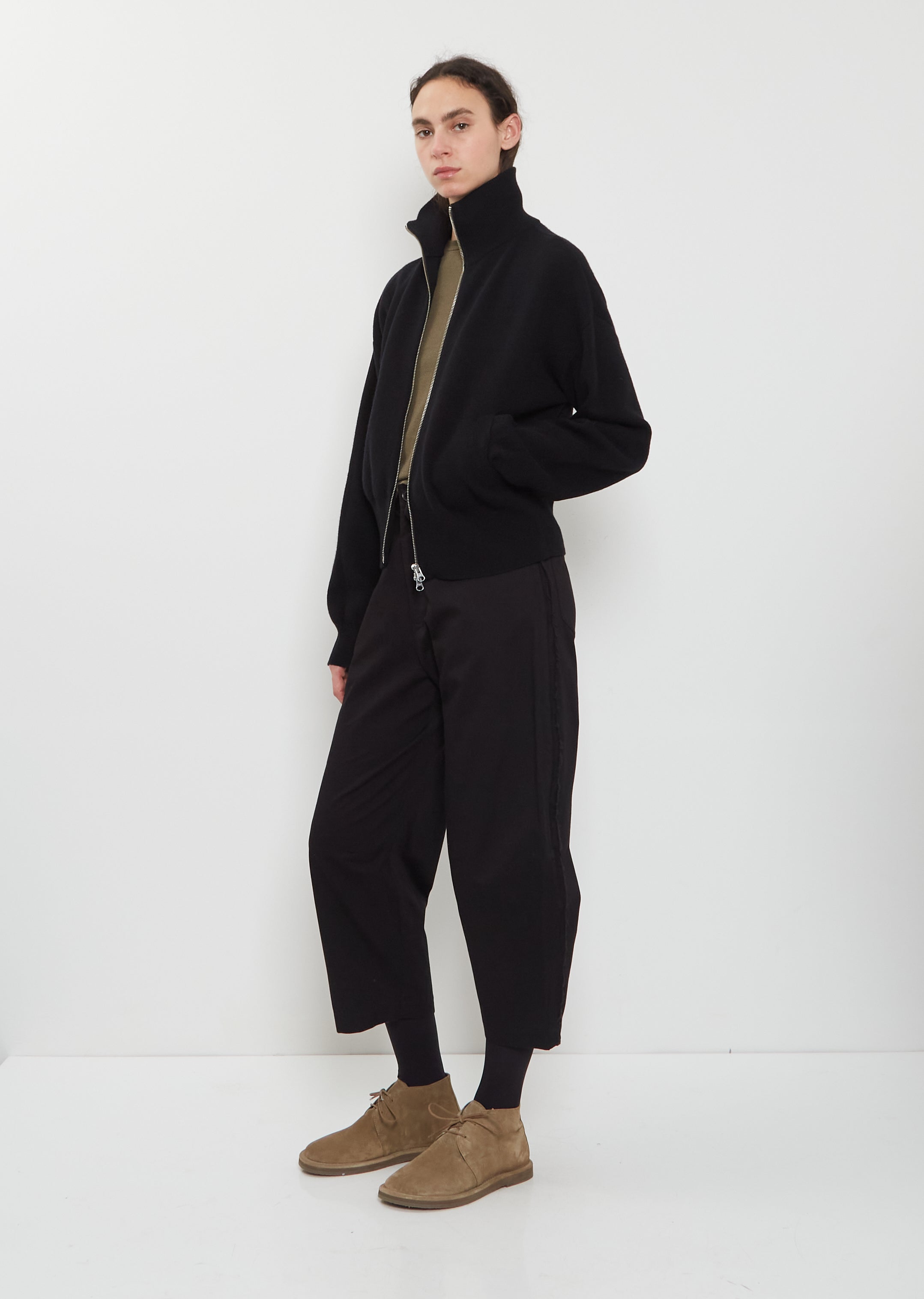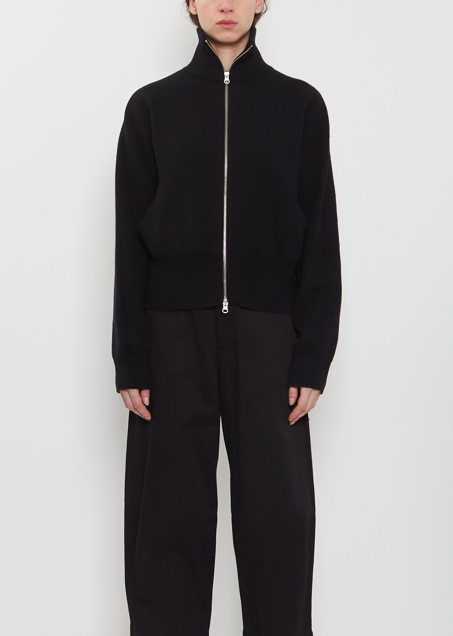 Extreme Cashmere raven black cardigan with a cropped bomber fit and two-way zipper closure at front in luxurious cashmere jacquard knit. Features a high neck, dropped shoulders, angled pockets at sides and rib trim finishings at neck, cuffs and wide hem.