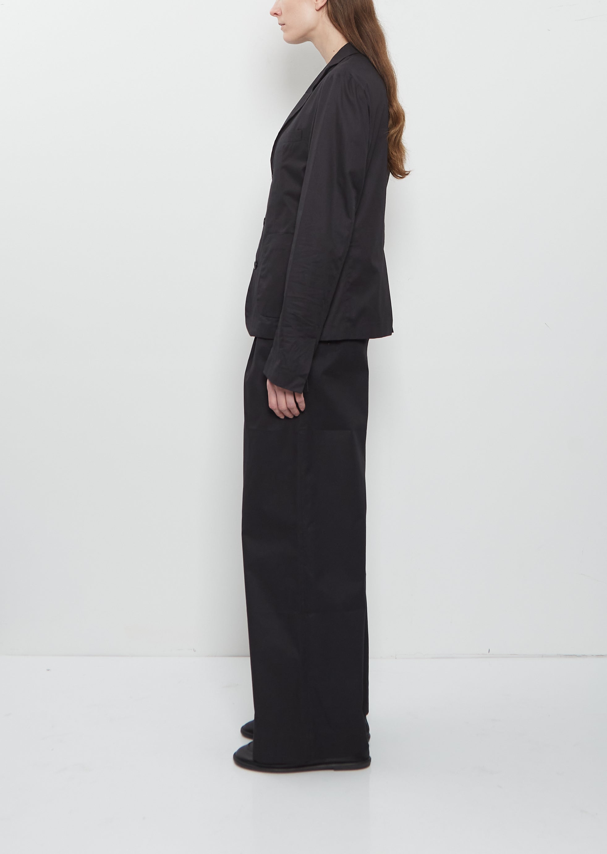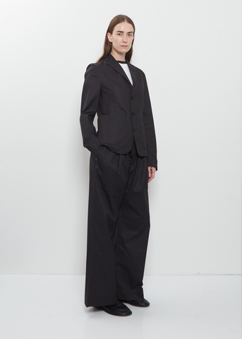 Meta Campania Collective black single breasted blazer in light cotton. Featuring a classic notch collar, and 3-pocket construction. Finished with tonal black button closure. Shaped silhouette with darting at princess seams for a regular fit. Comes unlined.