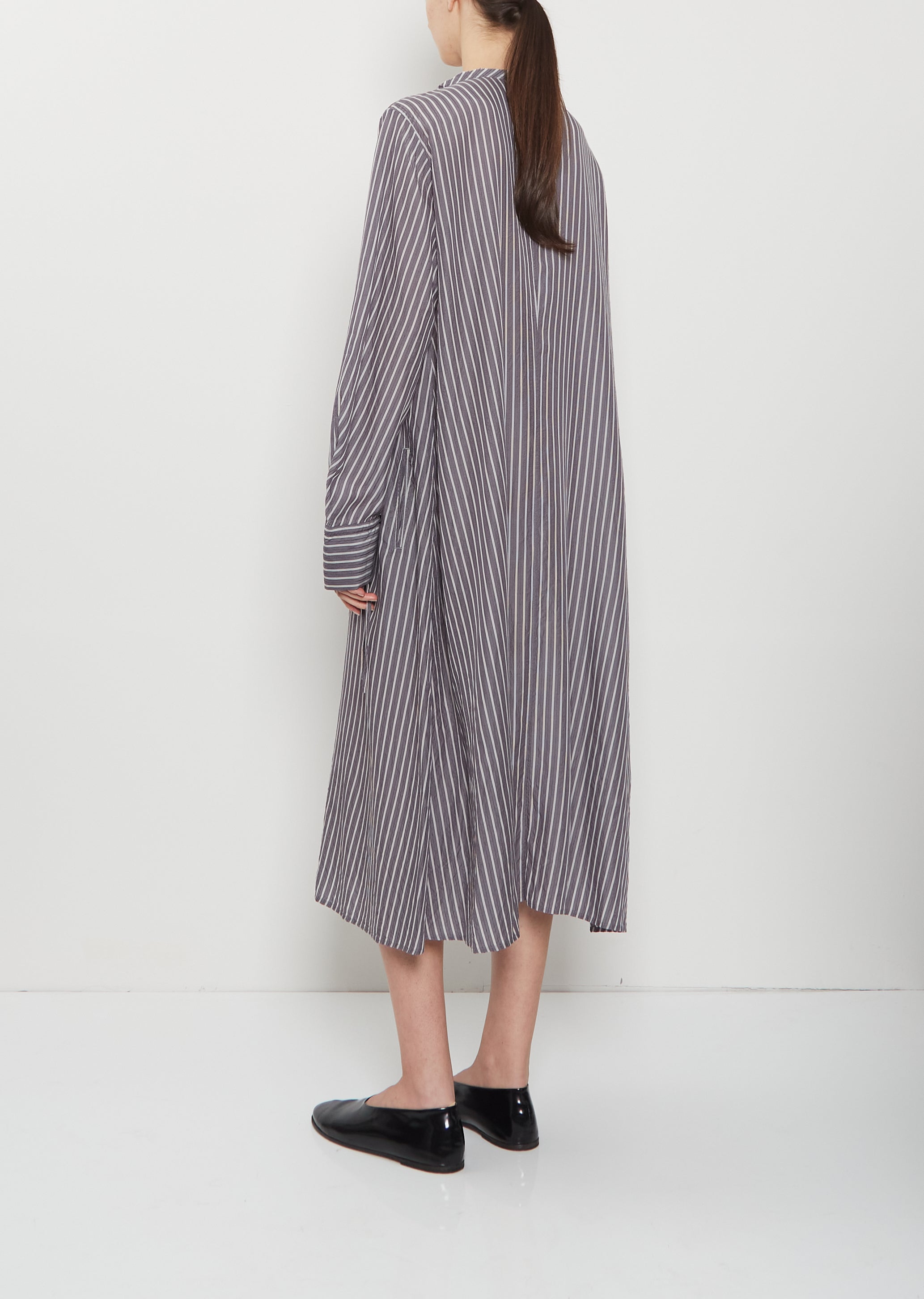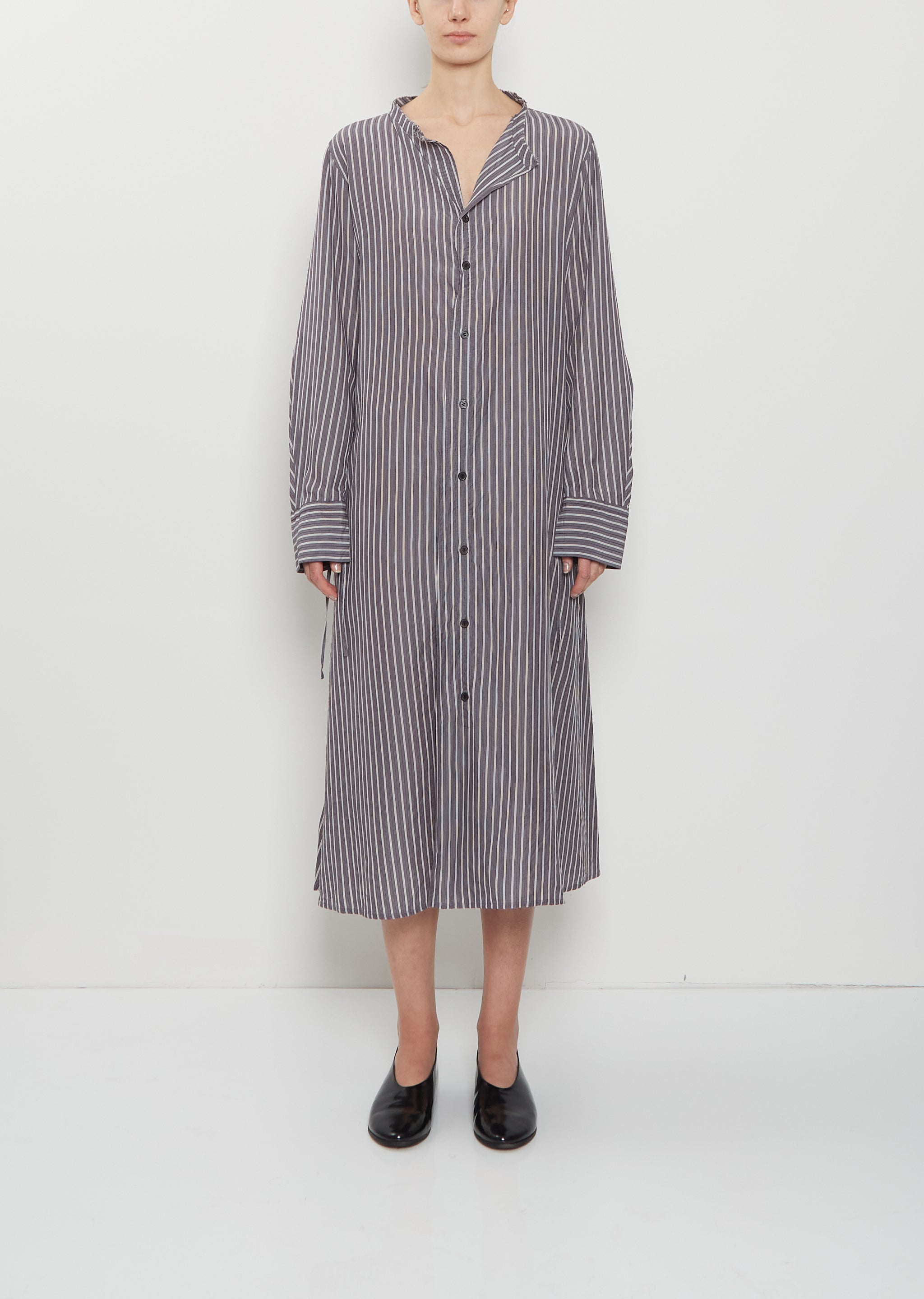 Y's grey and white stripe shirt dress with a collarless open neckline and elongated, wide cuffs in lightweight cotton lawn. Features a contrast stripe and string detailing at cuffs. Button closure at front with small, grey shell buttons. A-line silhouette with a loose fit. Unlined.