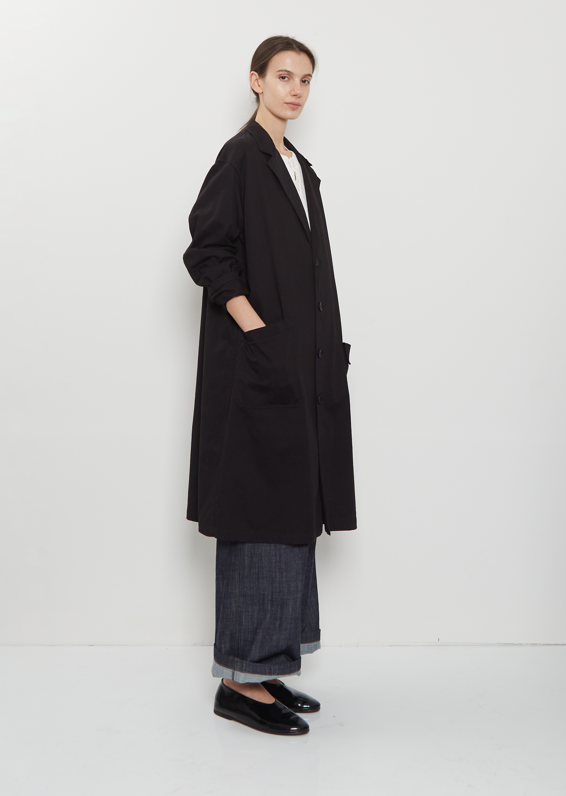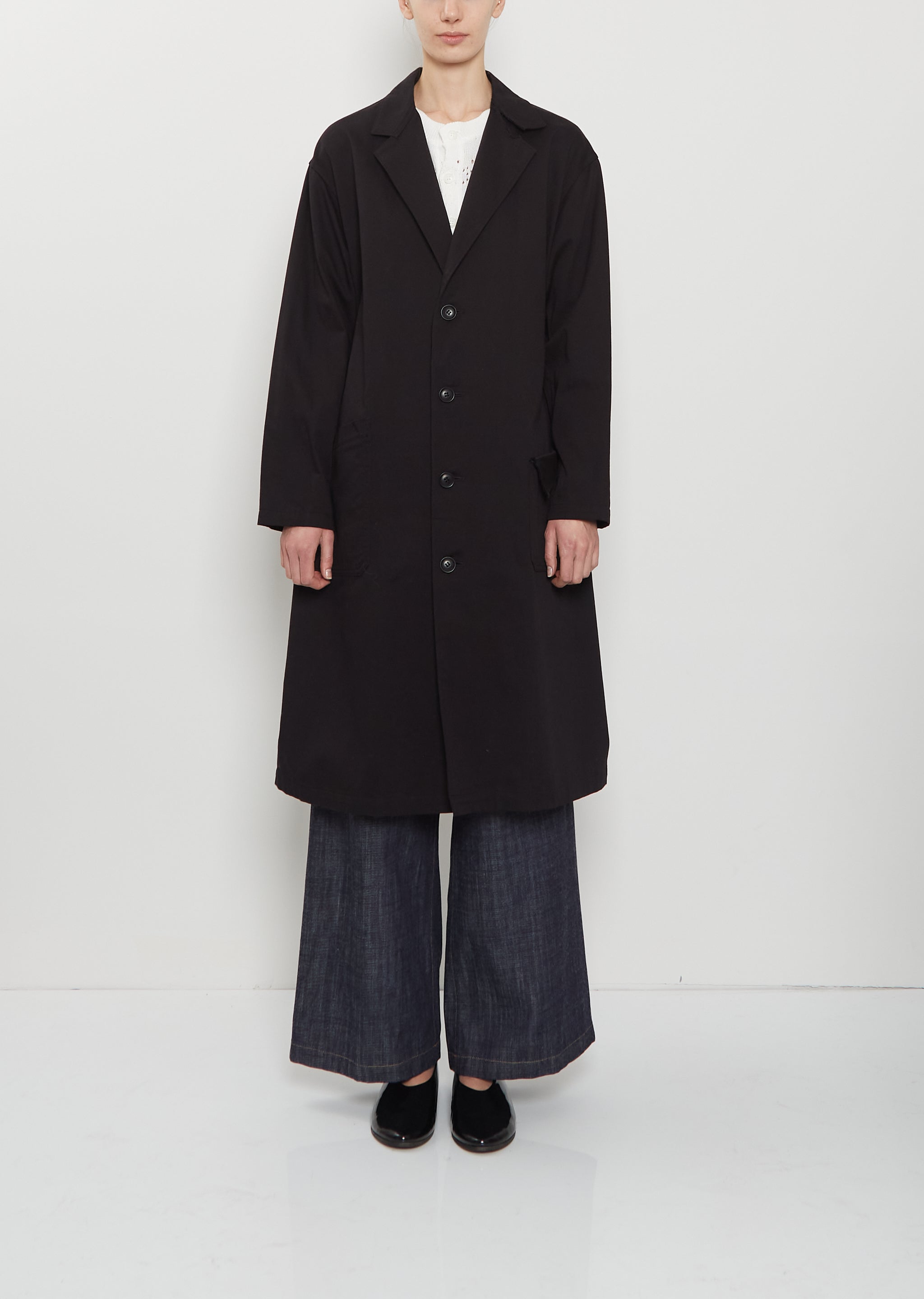 Y's black single-breasted coat with asymmetric collar and front pockets crafted in soft cotton twill. Features a high slit at back hem and comes unlined. Finished with tonal button closure. Relaxed fit.