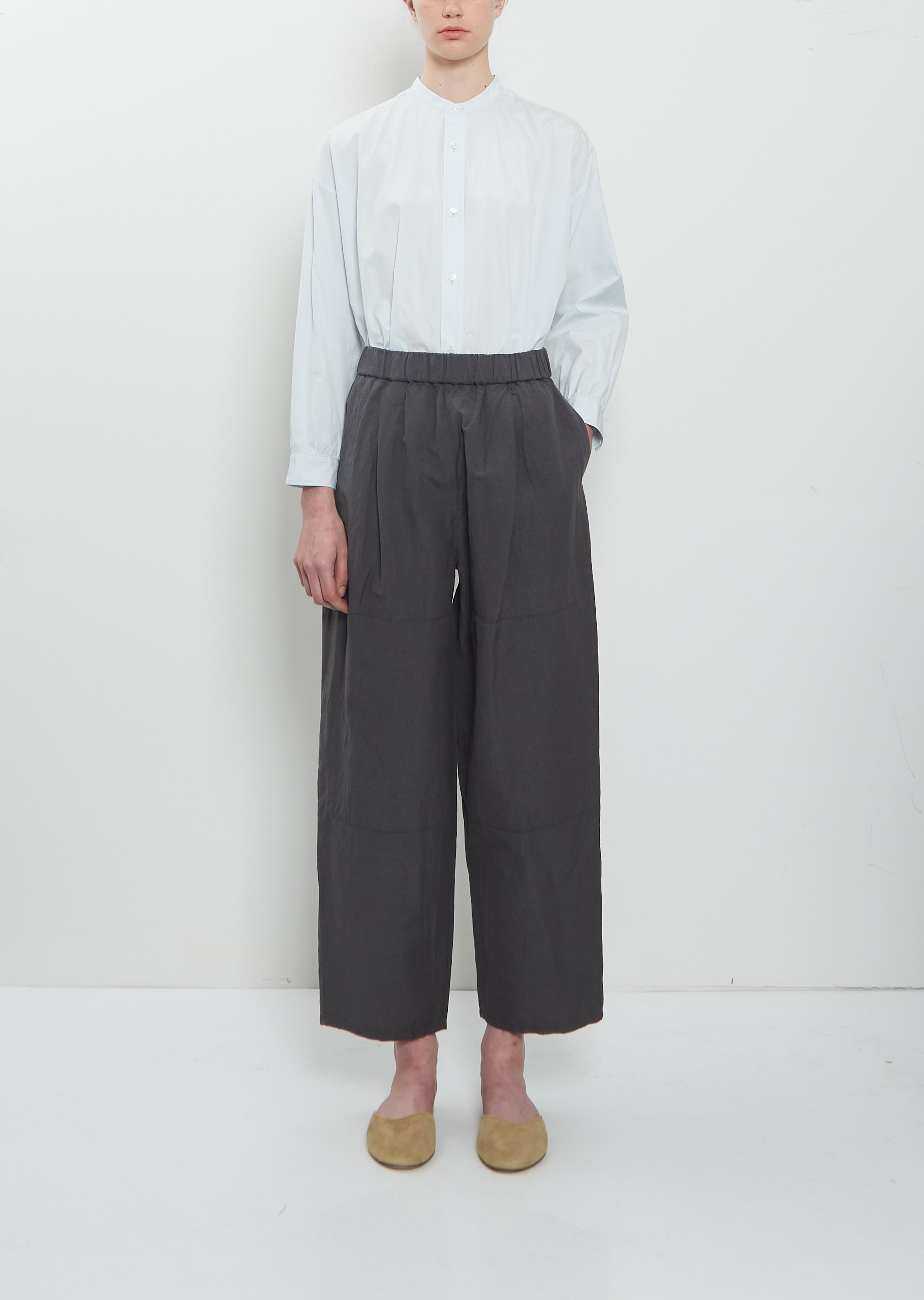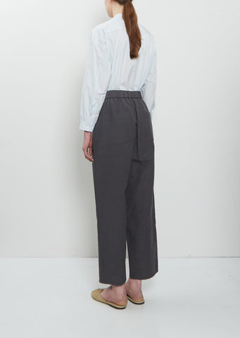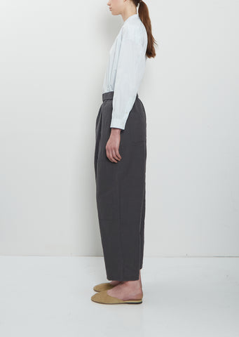 Arts & Science dark grey pull-on trousers with slightly tapered wide legs and a subtly pleated front in a airy linen and cotton blend twill.