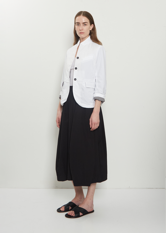 Bergfabel signature single breasted 3-button jacket with a closer fit in a lightweight cotton. Crafted with a rumpled effect at sleeves and back bodice. Features a notch collar that can be worn up or down, flap pockets, and single chest welt pocket. Finished with horn-hued buttons at front and two button sleeves. Double vent at back. Comes fully lined in a grey cotton fabric.