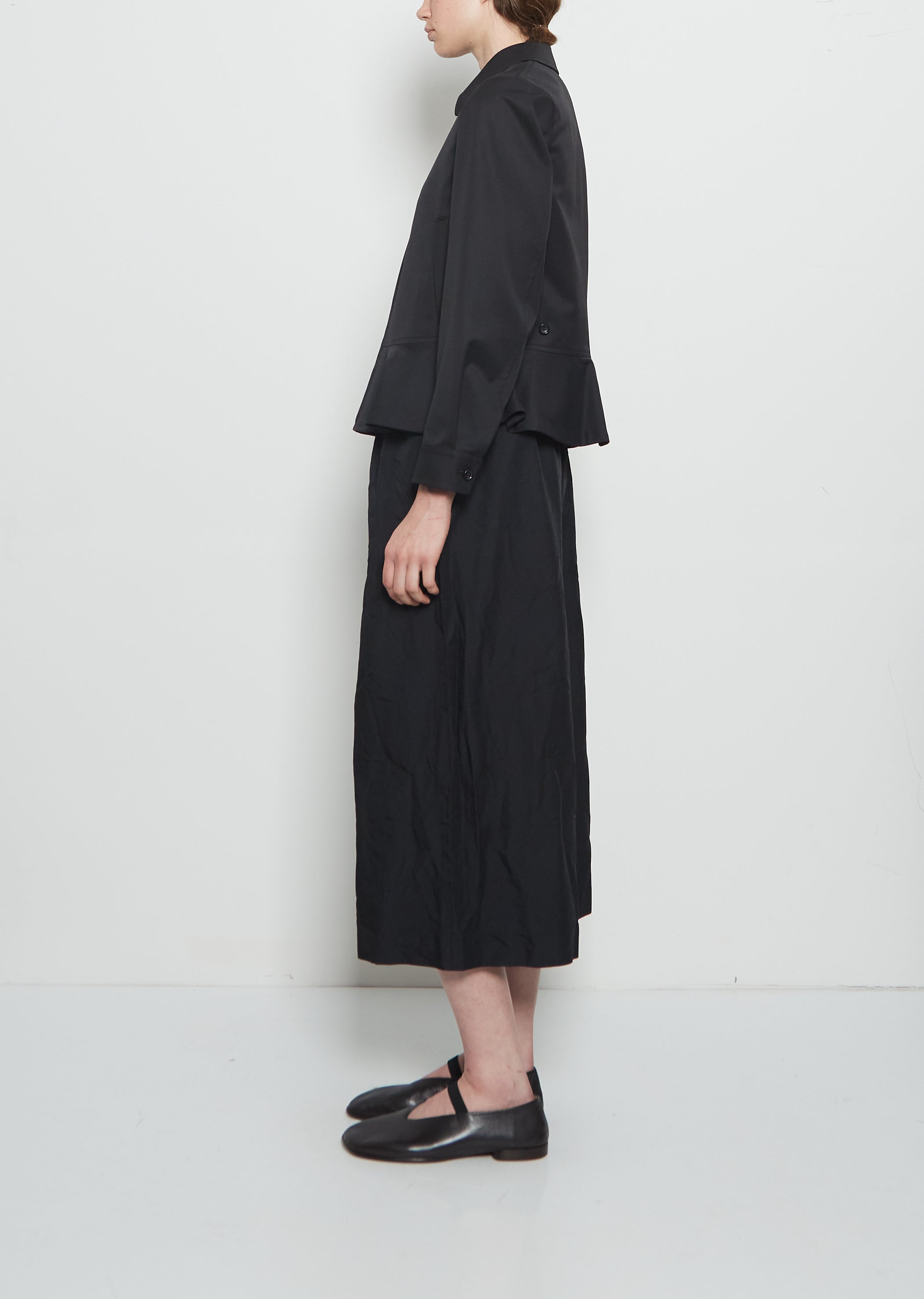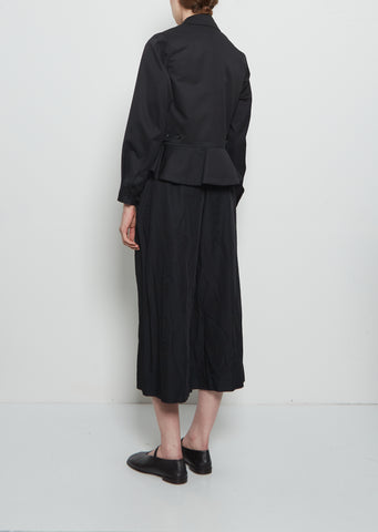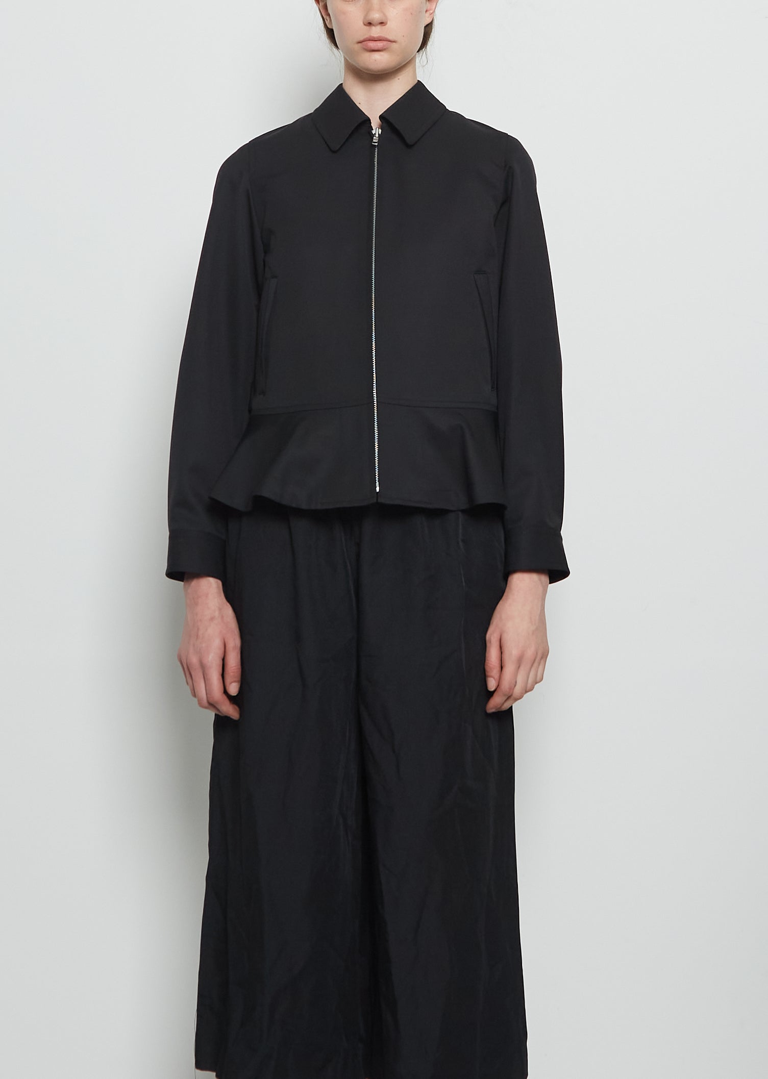Comme des Garçons zip-up jacket with a shirt collar and peplum hem in light tropical wool blend.