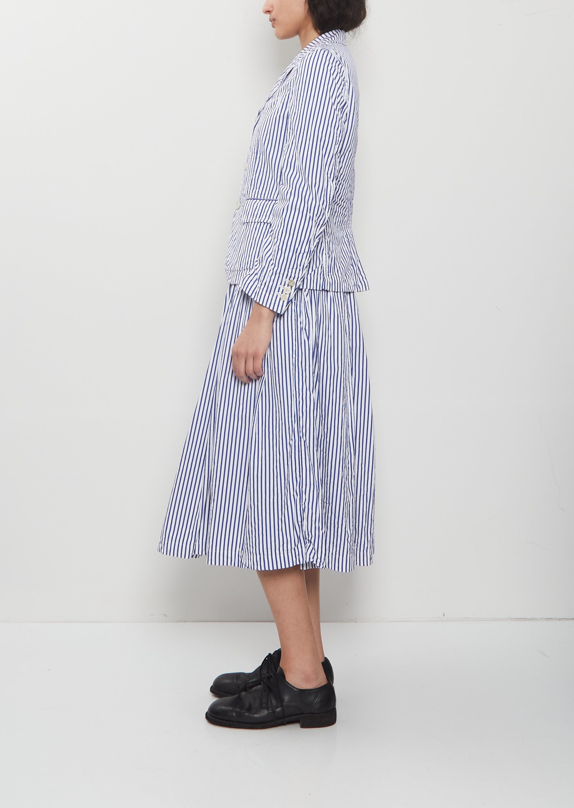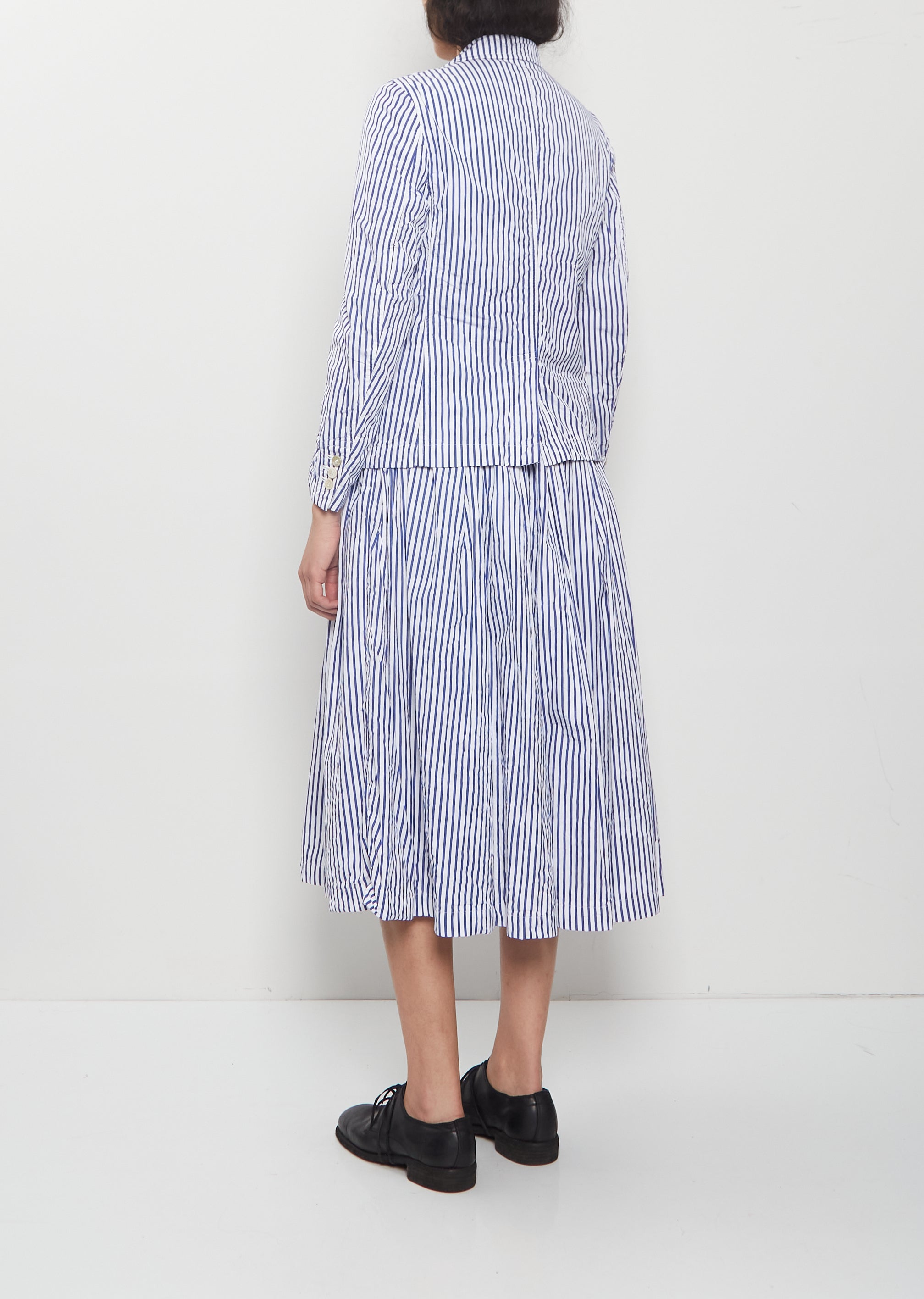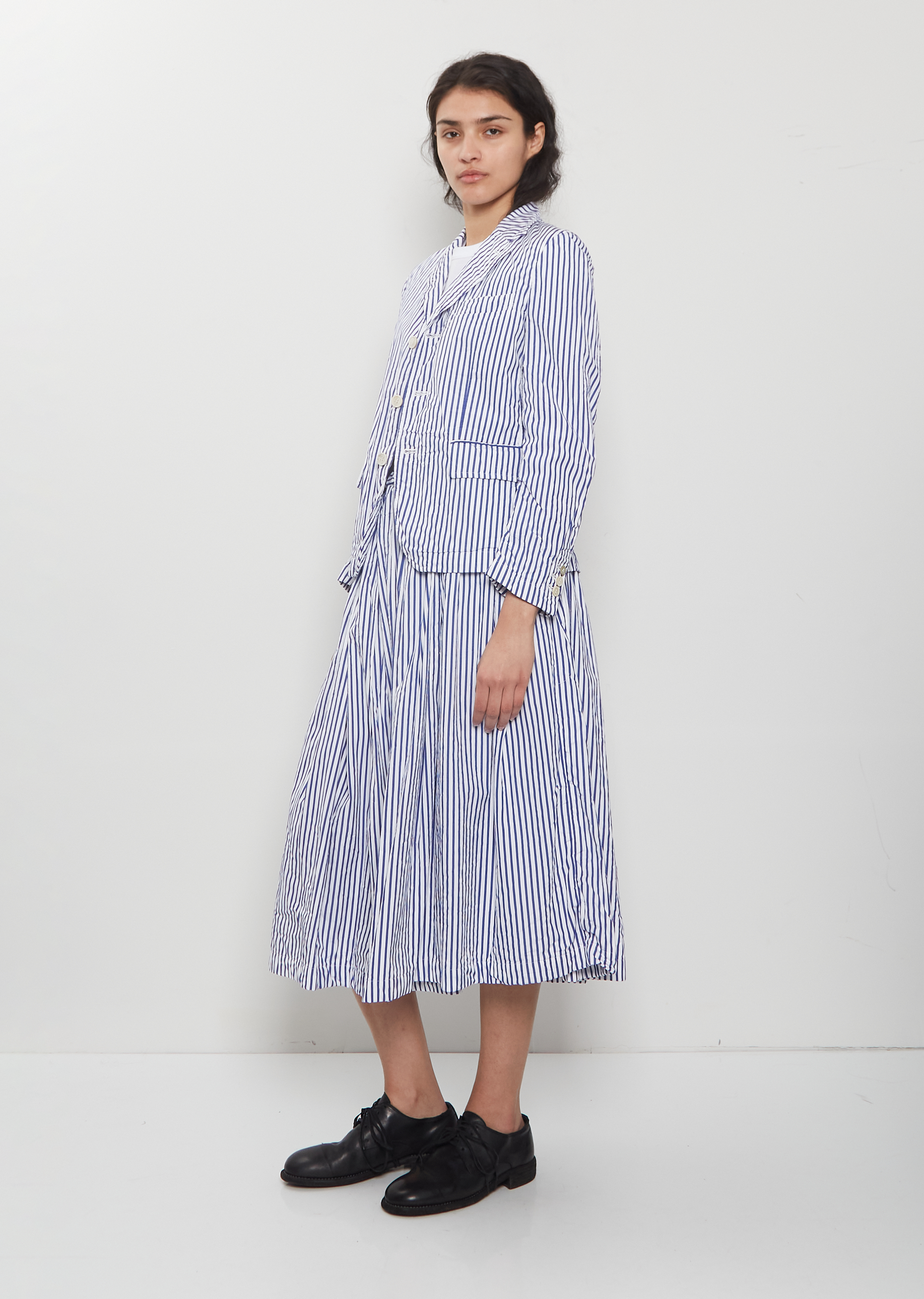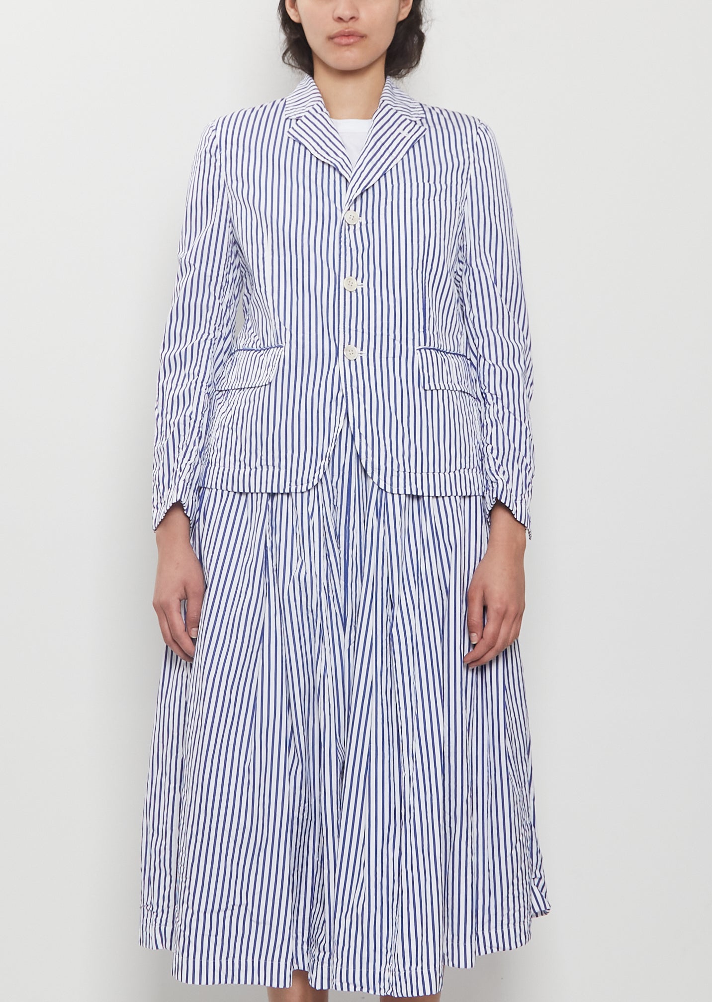 Comme des Garçons Comme des Garçons white and blue stripes single-breasted blazer with a notched collar and flap pockets in a dense and textured cotton poplin with a slight crinkled effect. Features a single welt pocket at chest, buttoned cuffs, a slit at back and a horn-hued buttons closure at front. Comes fully lined in white cotton poplin.