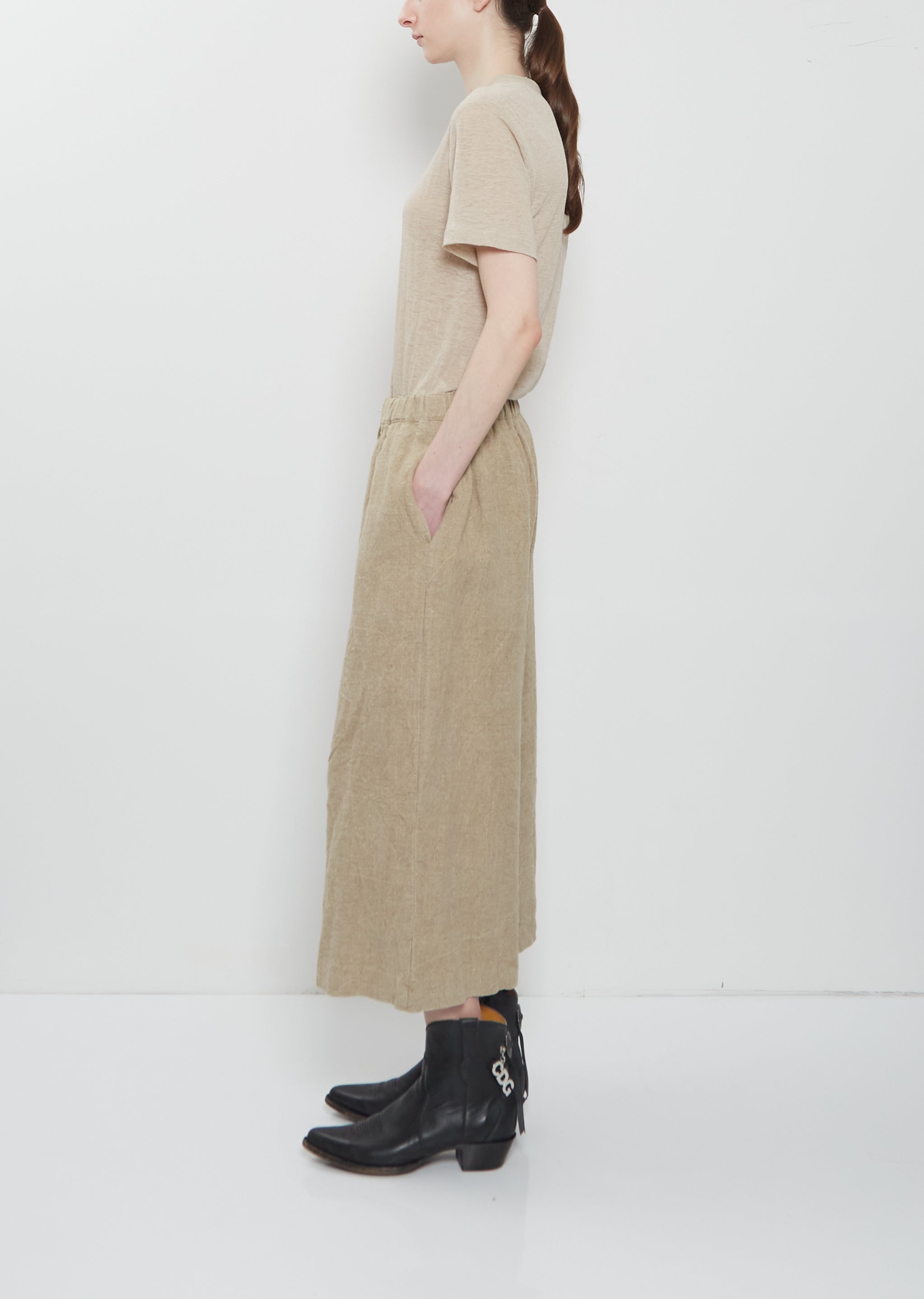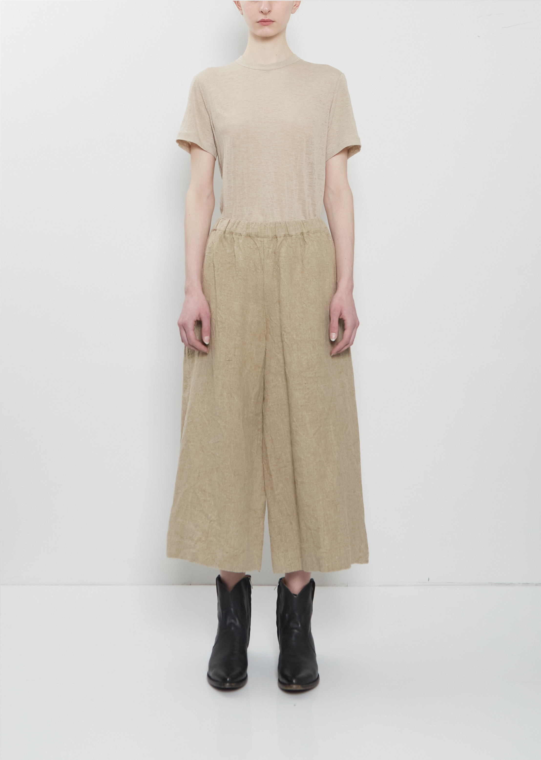 Comme des Garçons black pull-on pant with cropped, wide legs in dense linen canvas. Features an interior adjustable drawstring at elasticated waistband, and side seam pockets. Relaxed fit.