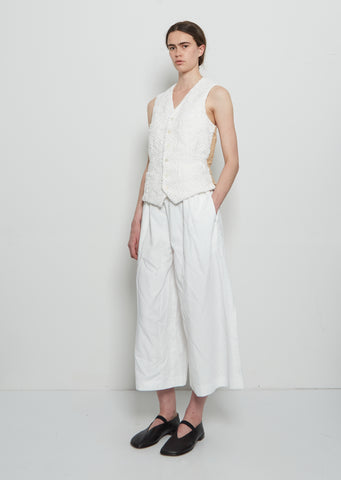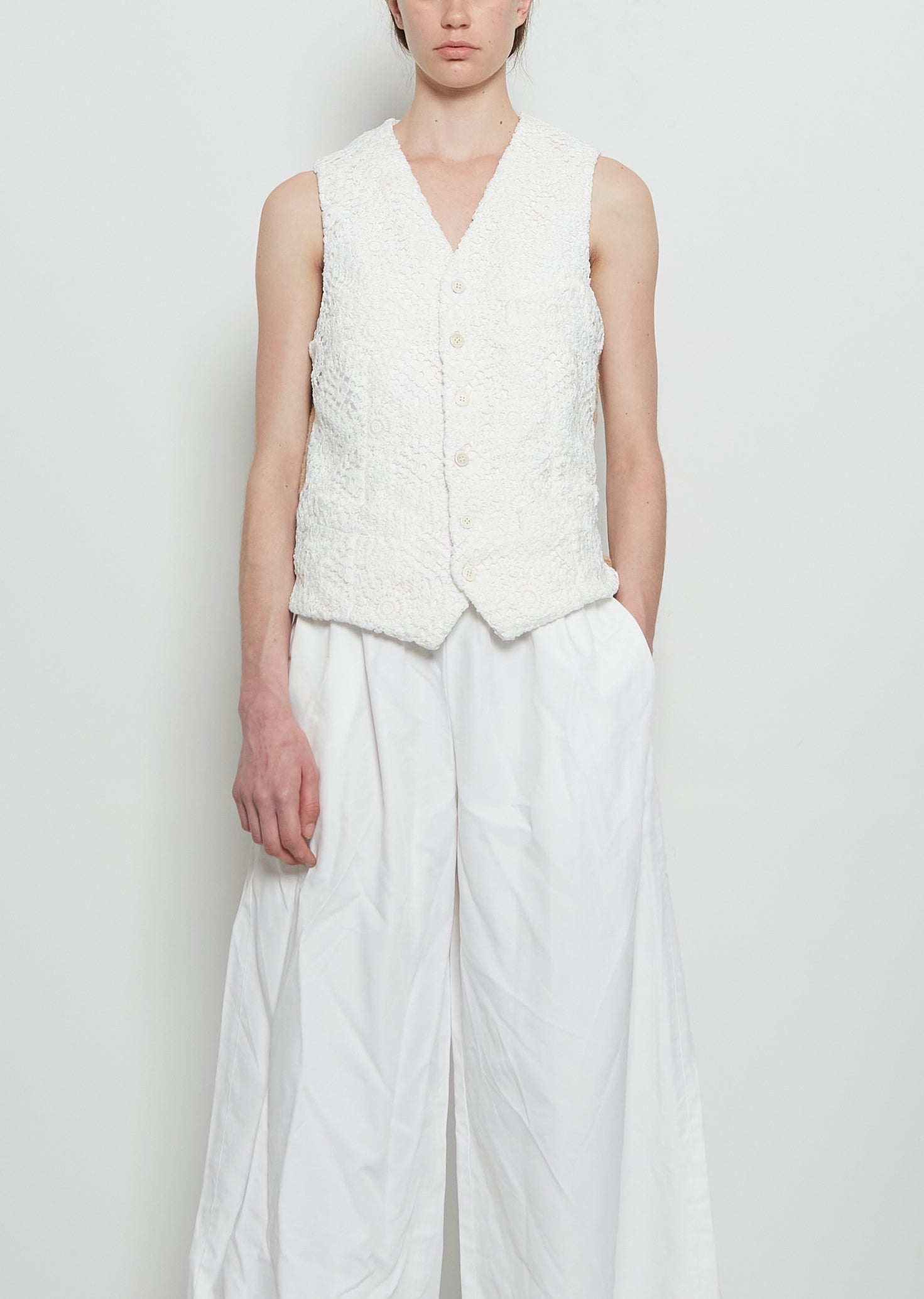 Comme des Garçons off-white lace button-up vest with contrasting linen back panel.