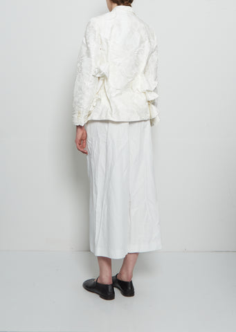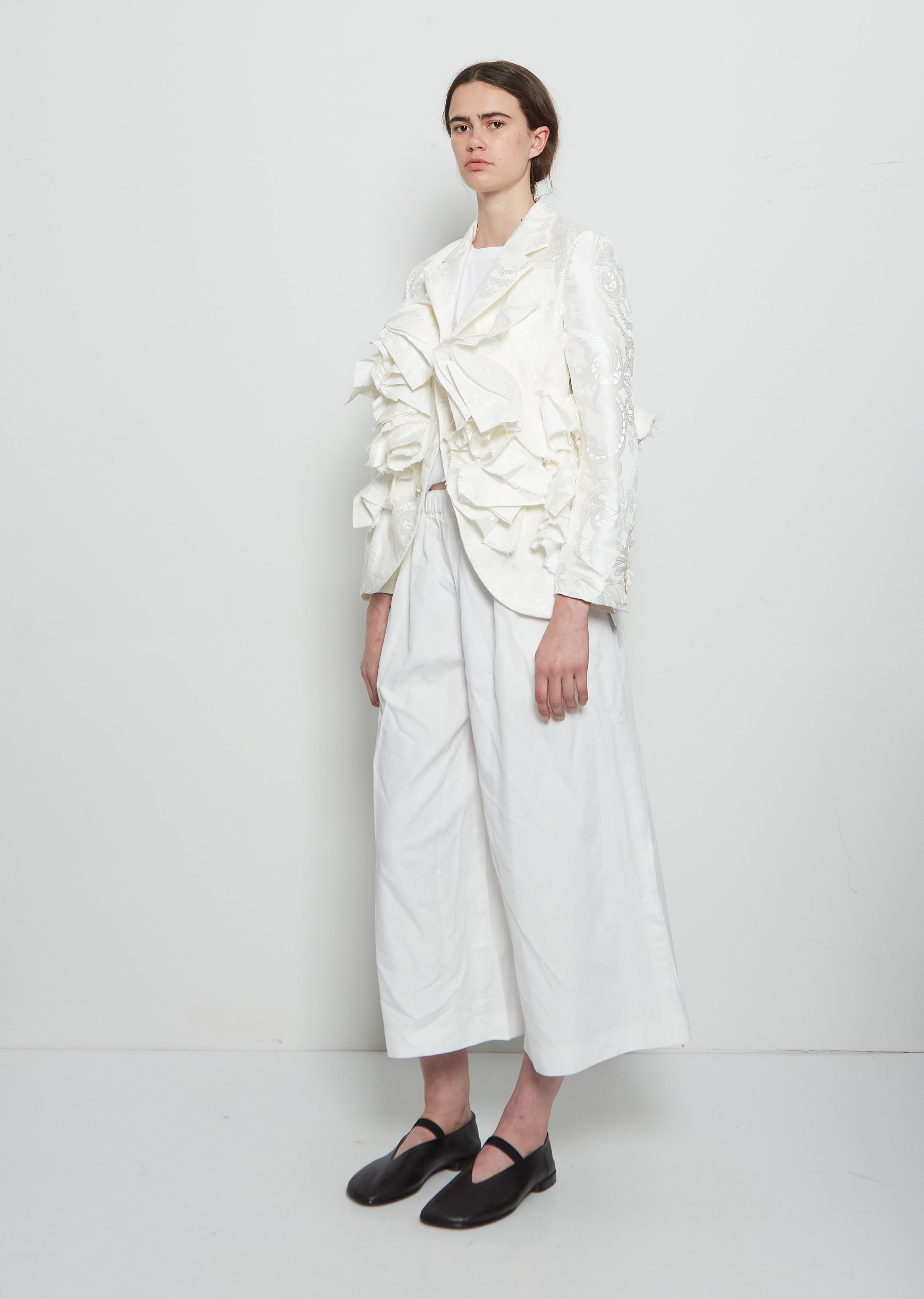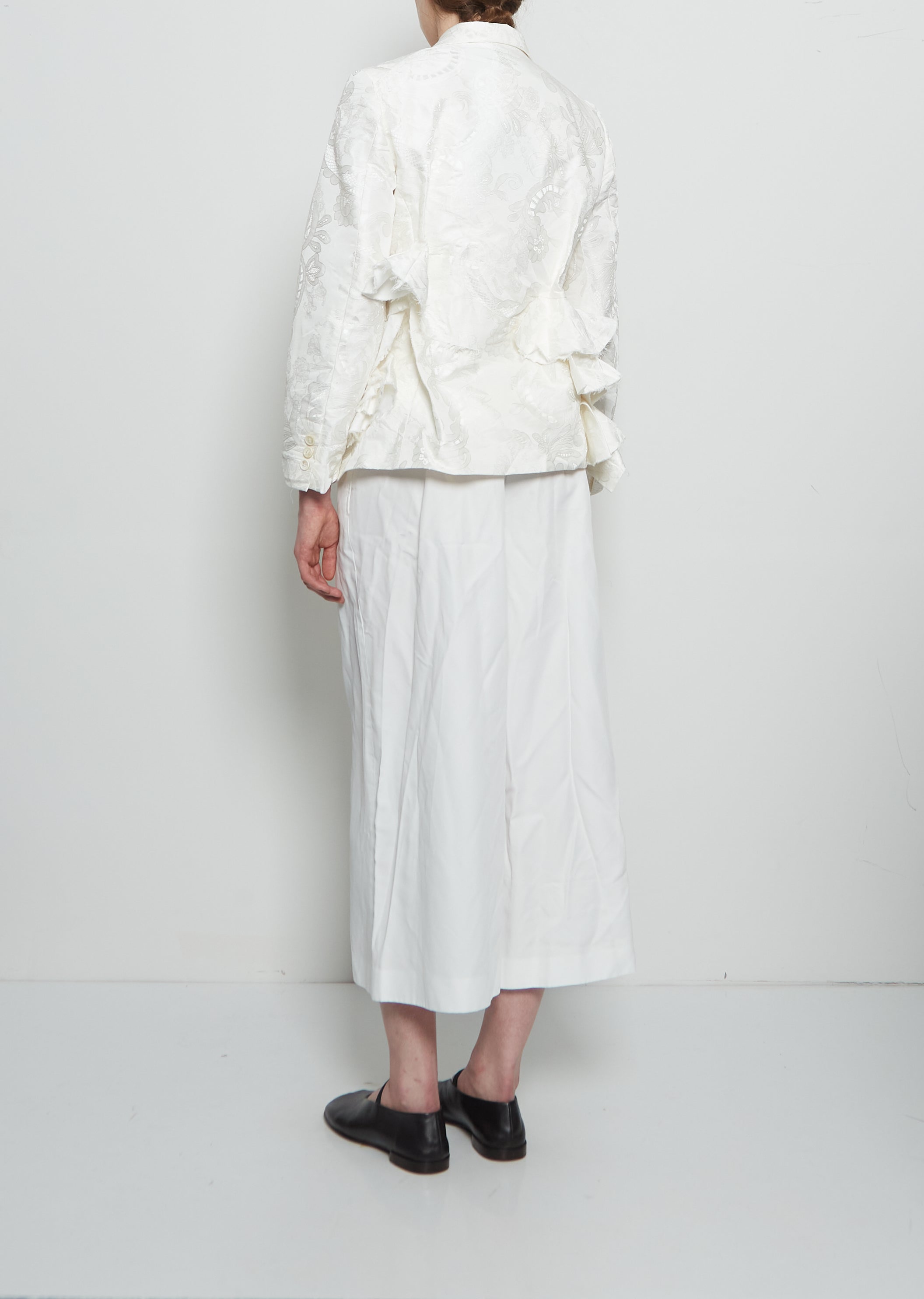 Comme des Garçons four-button blazer with ruffle applique front crafted in lace motif jaqcuard.