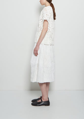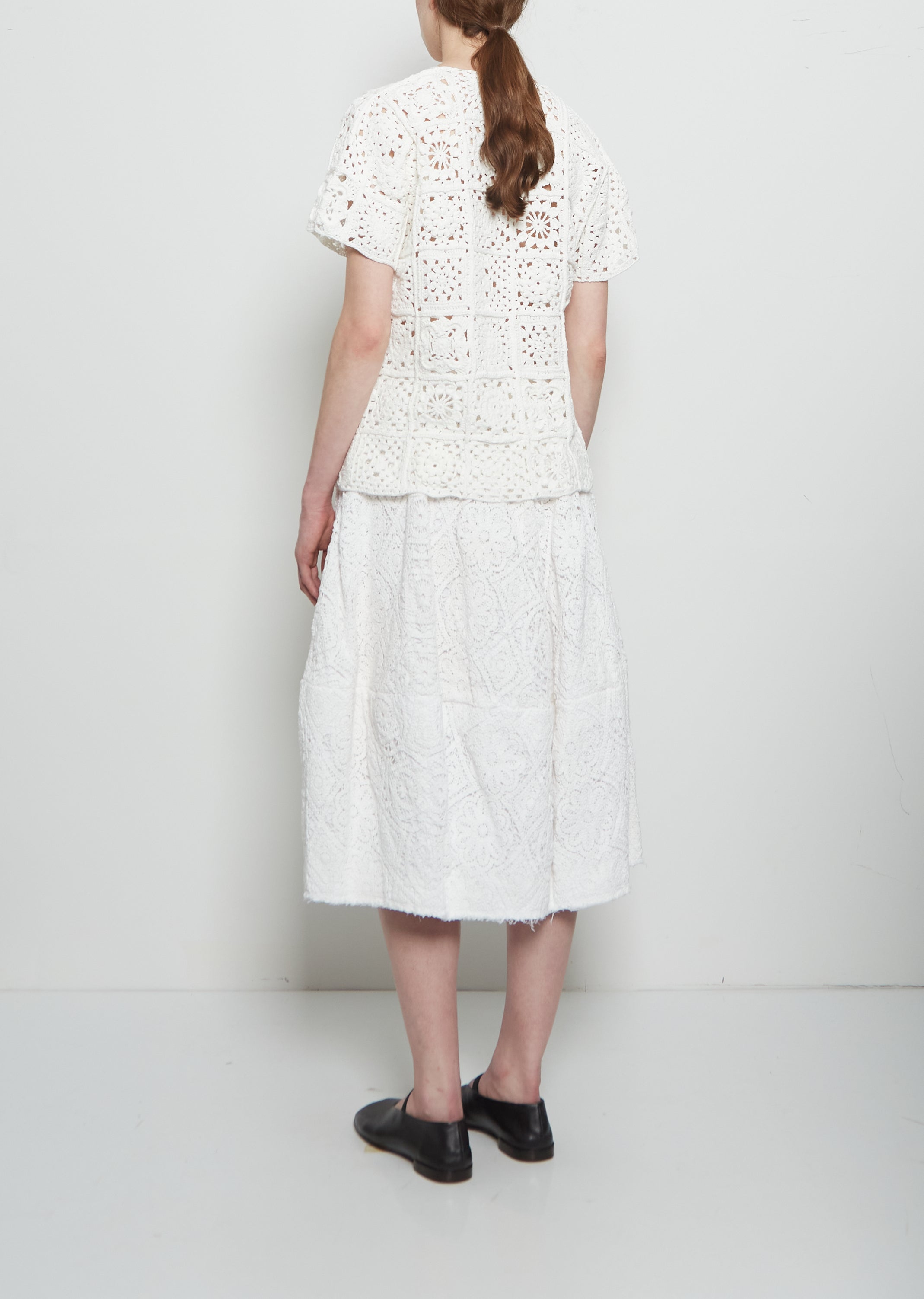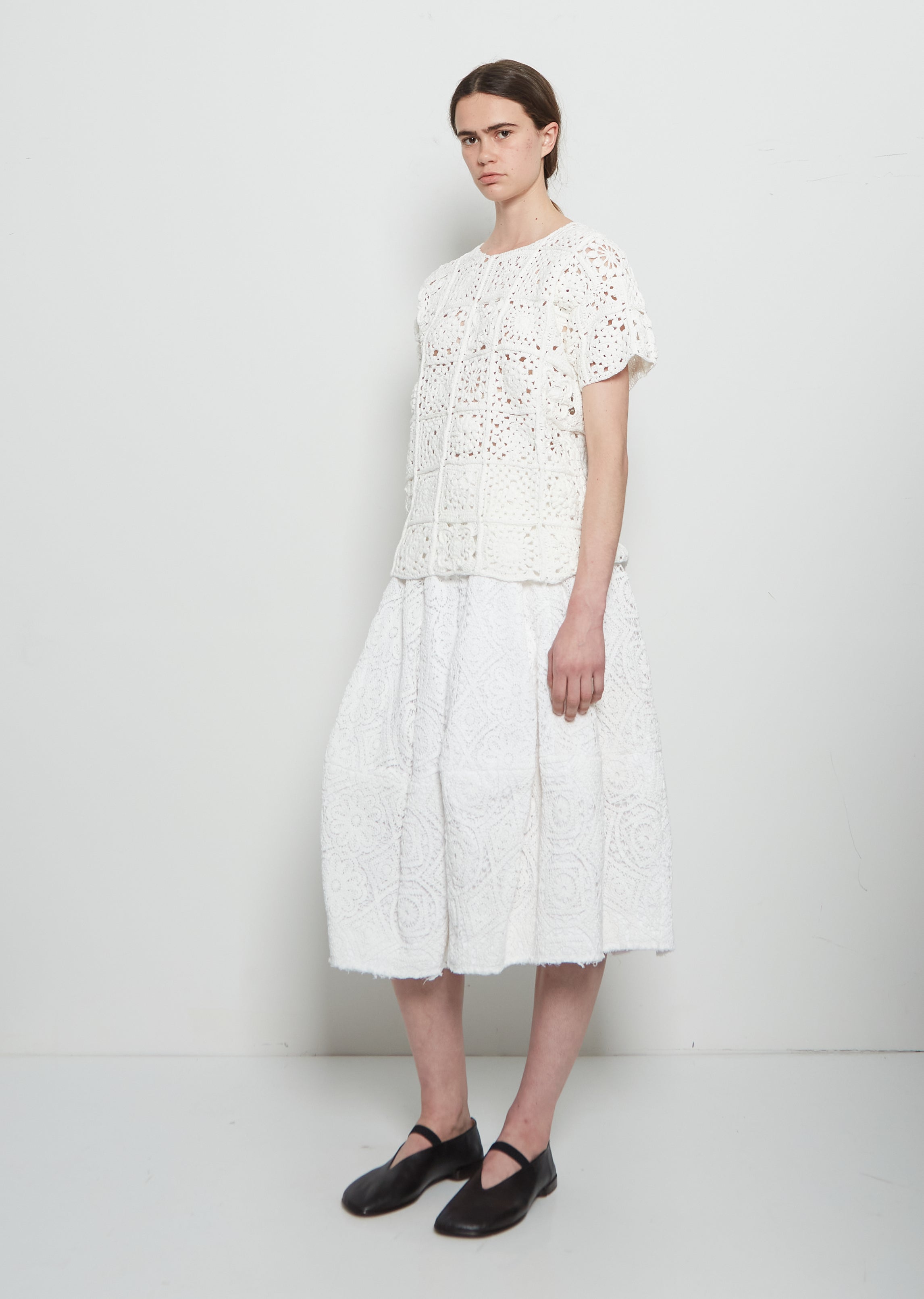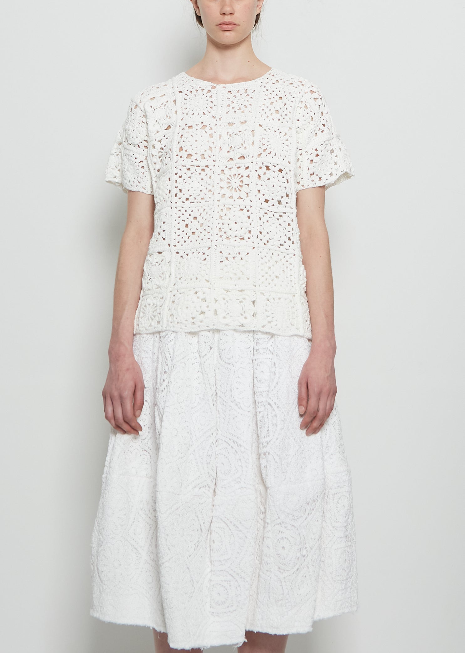 Comme des Garçons off white short sleeve top with a round neck in cotton crochet patchwork lace.