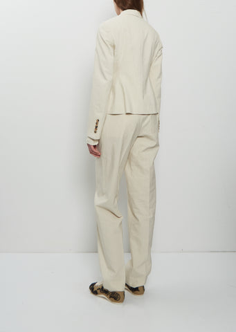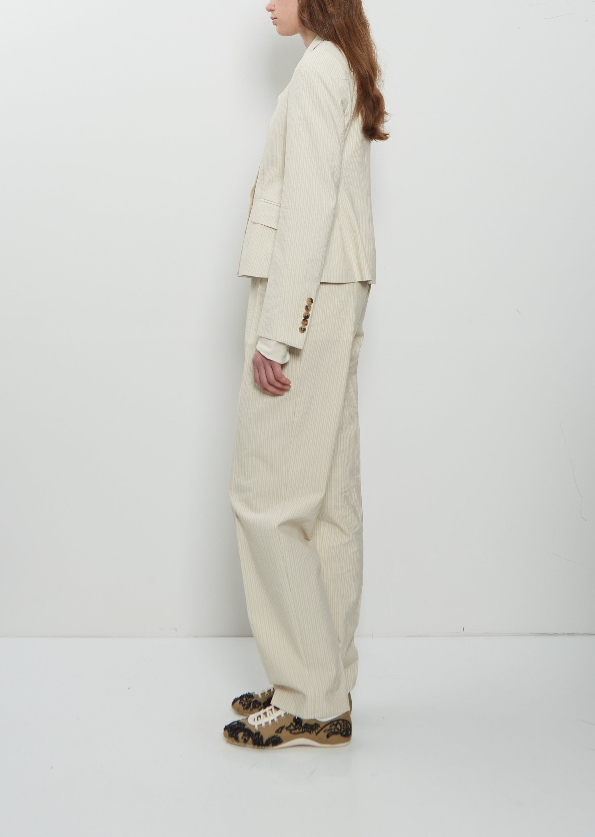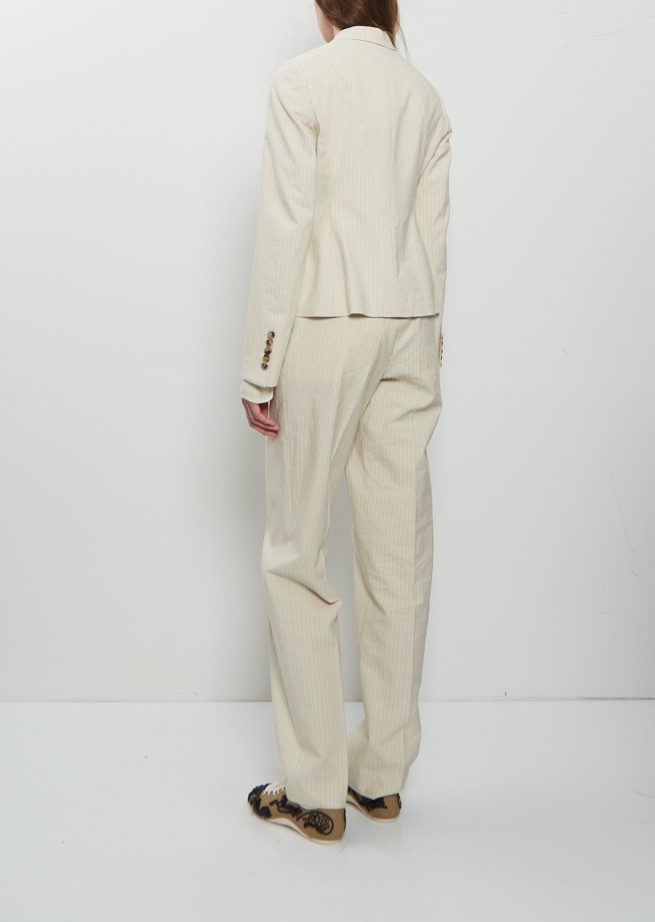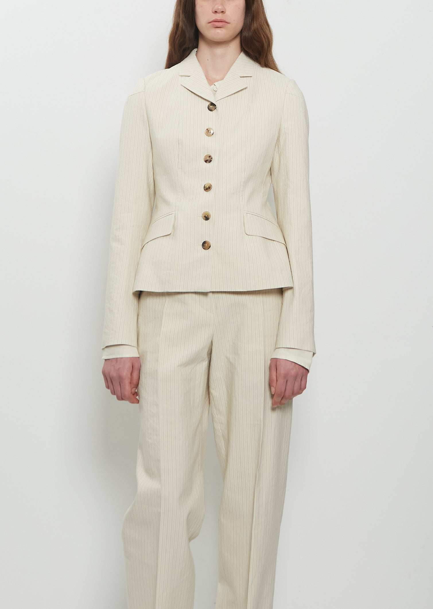 Dries Van Noten ecru striped tailored jacket with defined shoulders and a horn-hued button front placket crafted in a lightweight washed cotton blend fabric with a papery hand. Features a notched collar, buttoned cuffs and flap pockets at waist. Comes lined in tonal viscose. Shaped silhouette with darting at princess seams for a closer fit. Collar can be worn up for a high neckline silhouette.