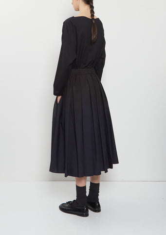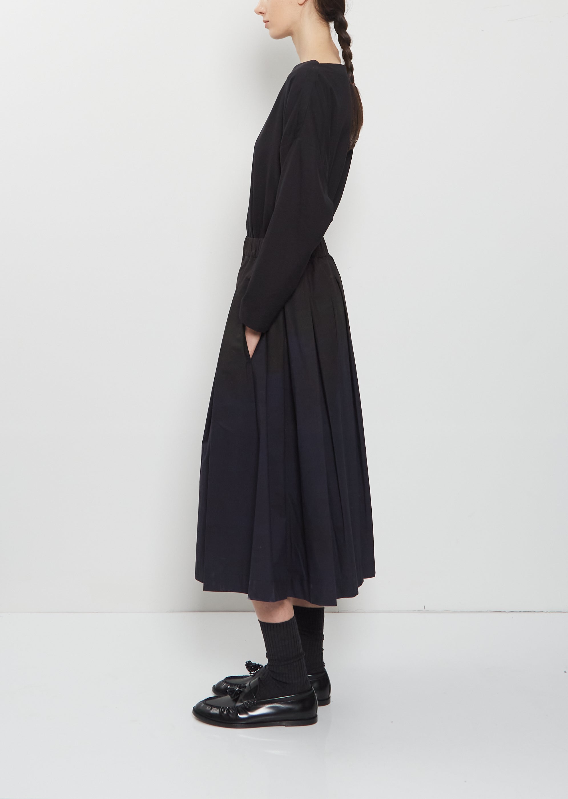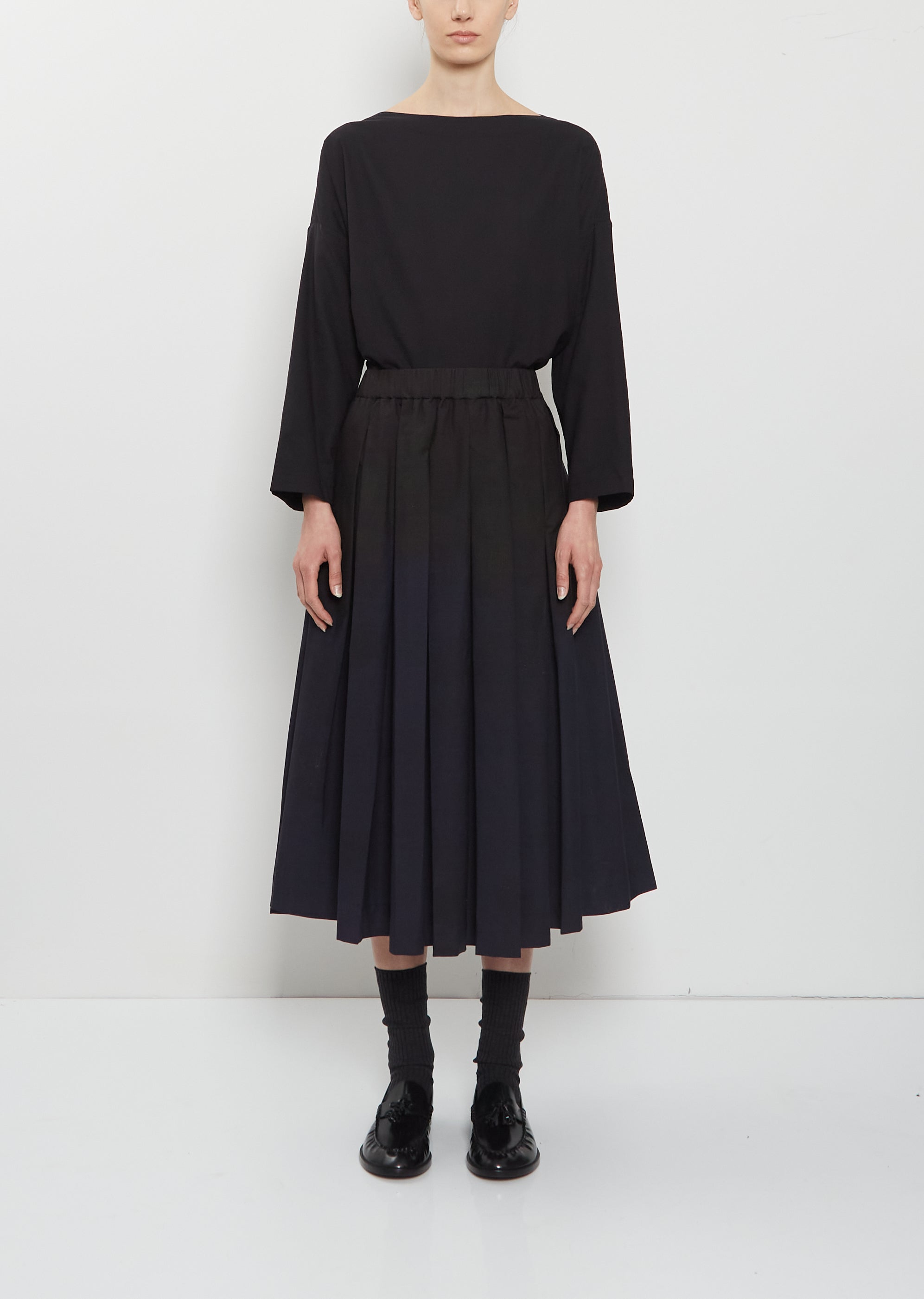 École de Curiosités dark navy signature pull-on pleated A-line skirt with an elasticated waistband and interior adjustable drawstring in hand-painted and crisp densely woven cotton with a paper-like hand feel. Features box pleats throughout and concealed side seam pockets. Comes unlined.