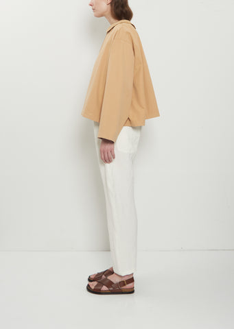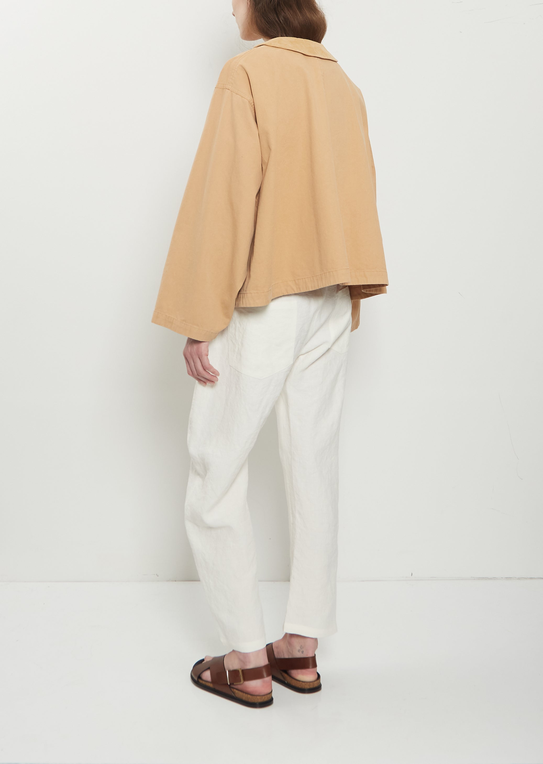 Eleph sand beige cropped coat with a rounded collar and horn-hued button front in mid-weight plain-weave cotton. Features dropped shoulders, oversized sleeves, and concealed side seam pockets. Comes unlined. Relaxed, boxy fit and a slightly curved hem.