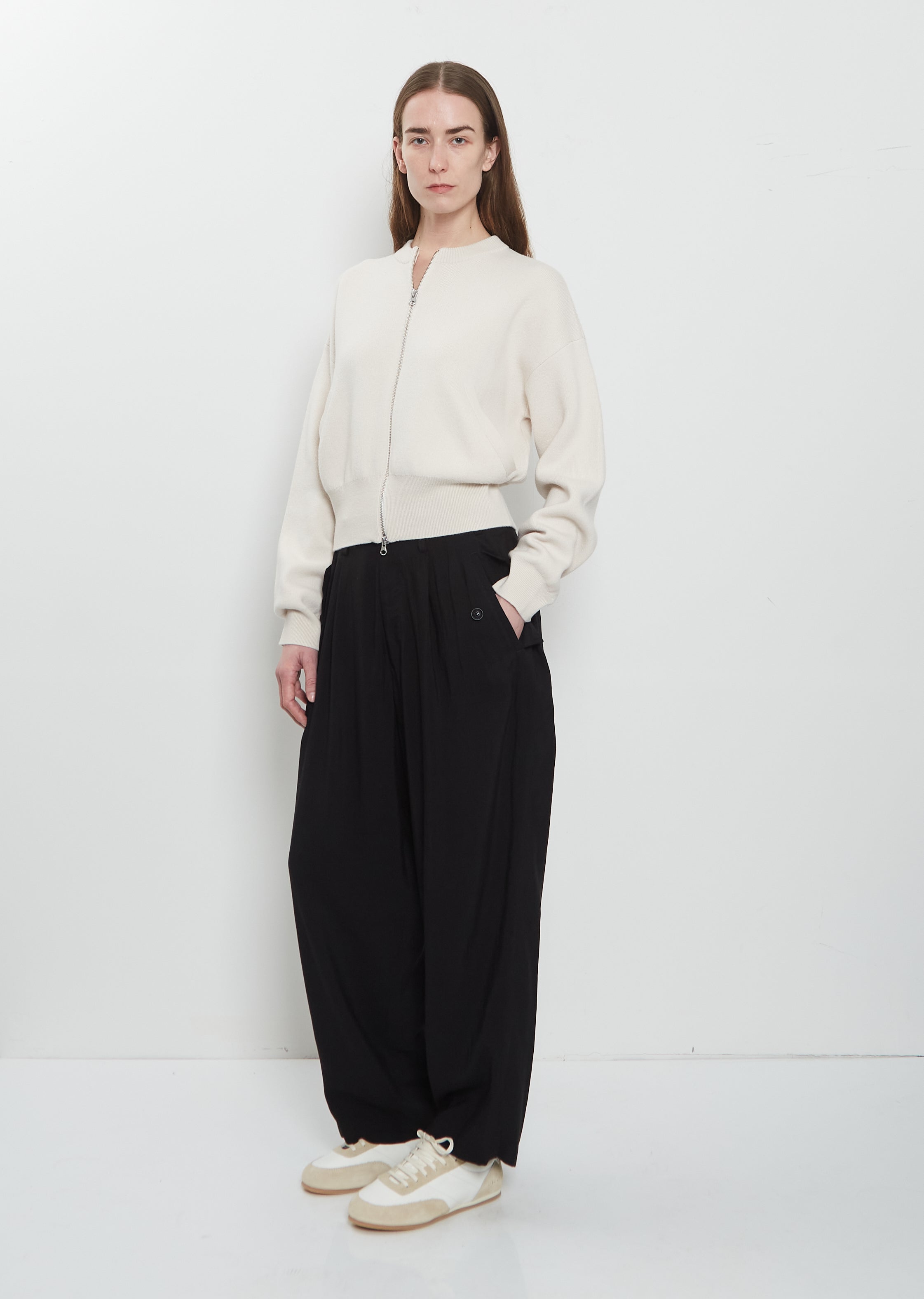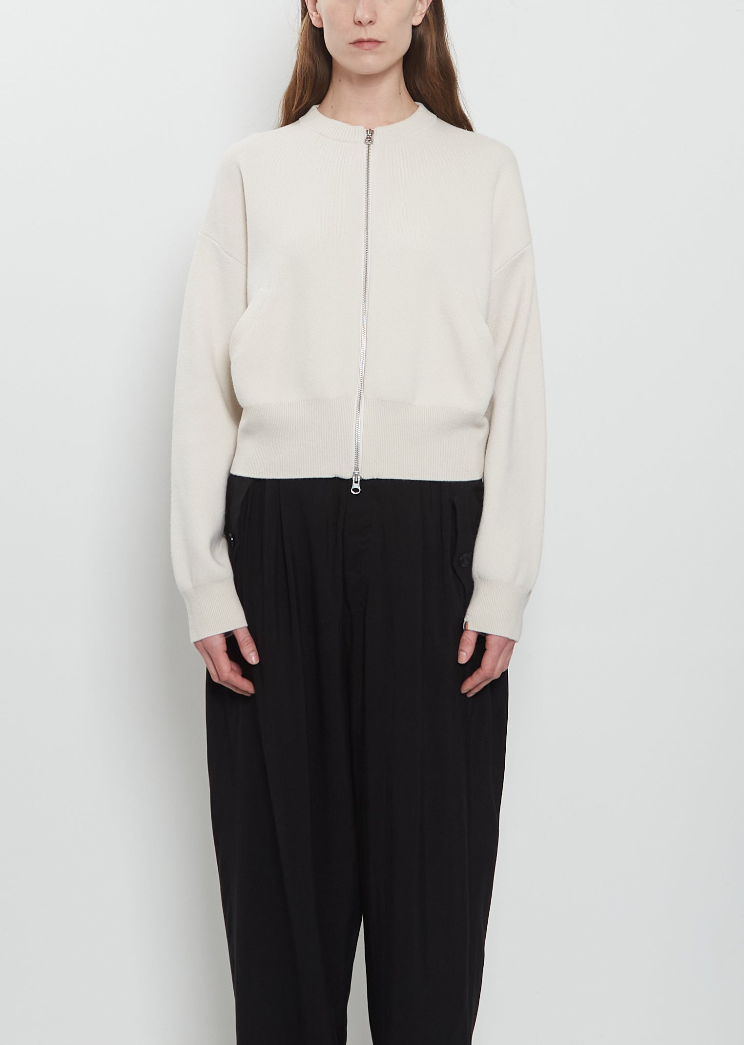 Extreme Cashmere cream bomber-style cropped cardigan with a crew neck and dropped shoulders in soft and long-lasting cashmere jacquard knit. Features angled welt pockets, a silver-toned two-way zipper closure and rib trim finishings at neck, cuffs and hem. Boxy fit.
