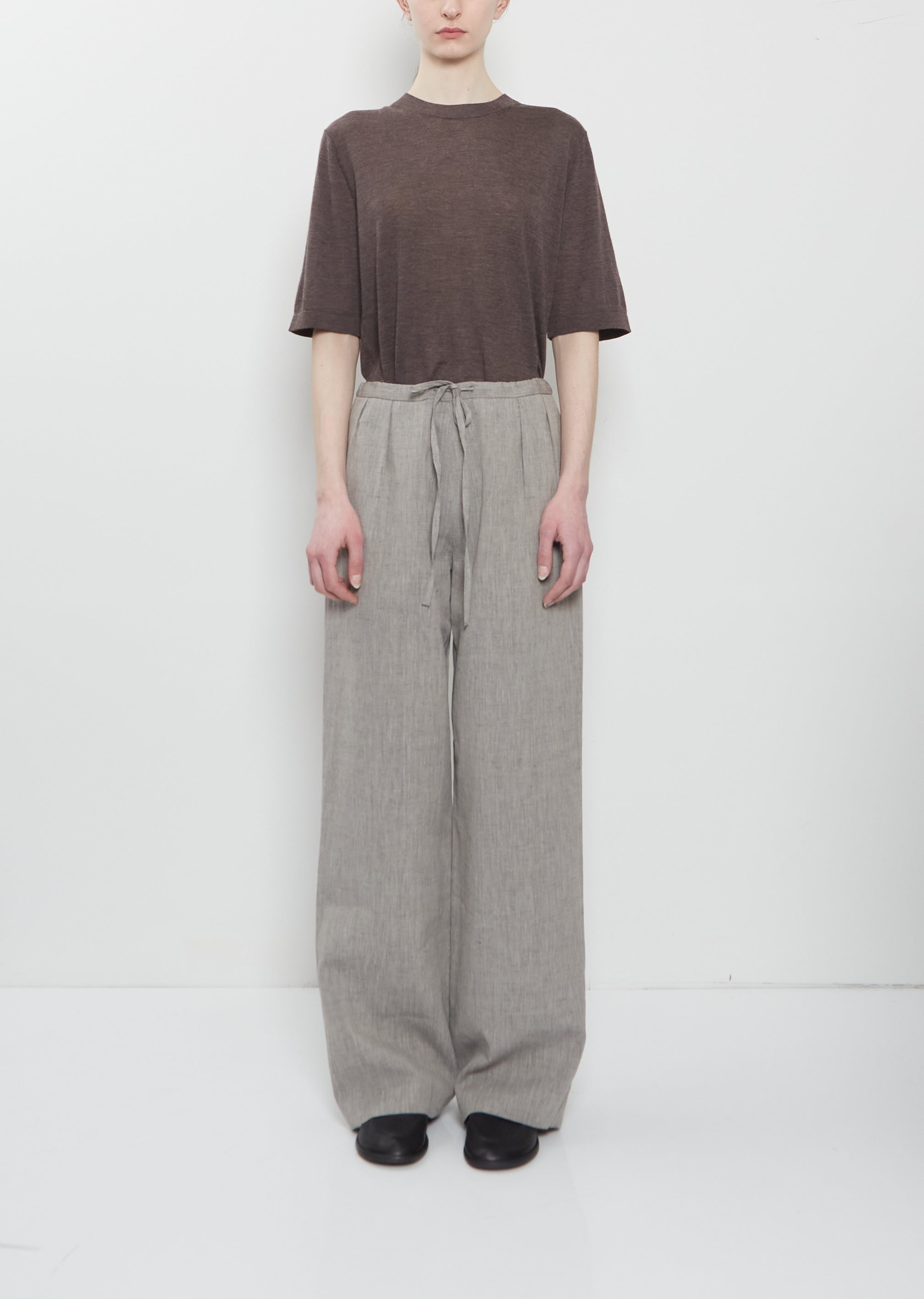 Loulou de Saison grey mélange pull-on trousers with wide, straight legs and double front pleats in linen and cotton blend twill. Features a tonal adjustable drawstring at waist and side seam pockets. Relaxed fit.