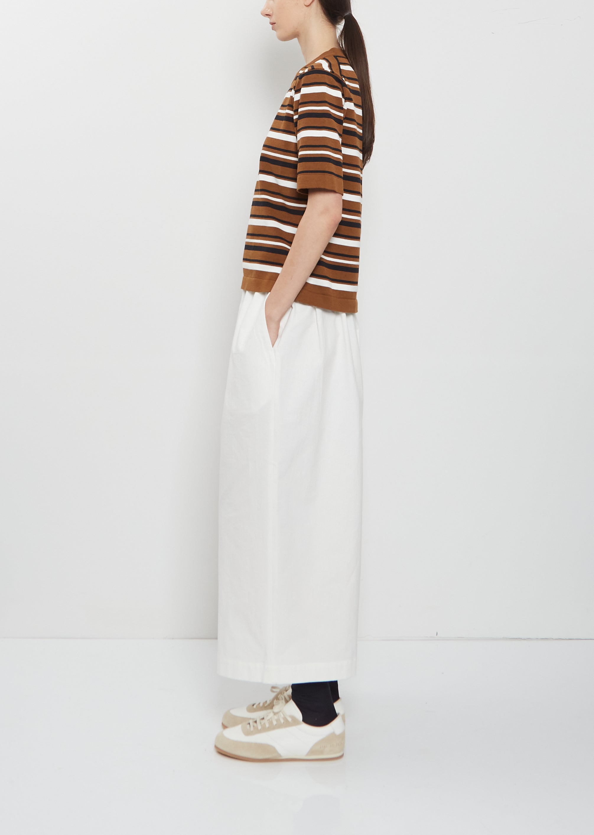Margaret Howell brown, white and black stripes t-shirt with a crew neck and short sleeves in fine gauge cotton and linen blend knit. Features a straight hem and ribbed trim finishings at neck, sleeves and hem. Boxy fit.