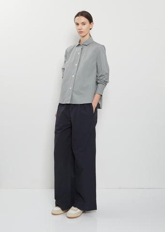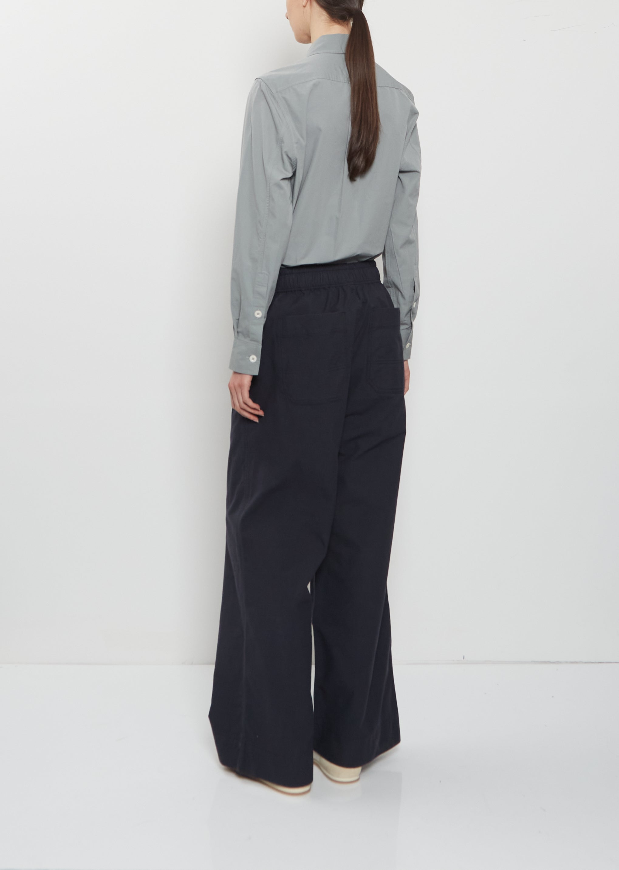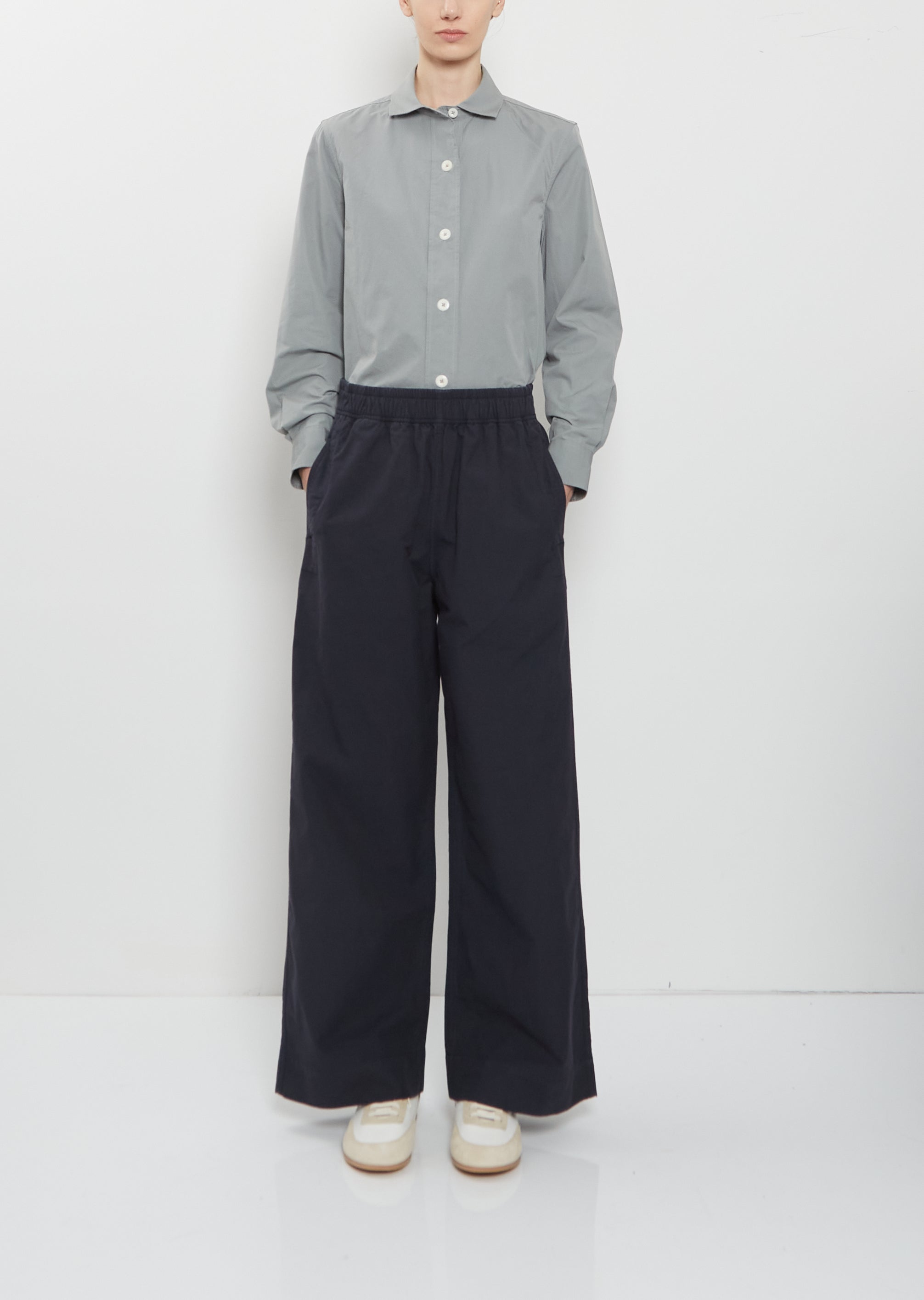 MHL by Margaret Howell ink blue pull-on jogger with wide, straight legs and an elasticated waist in heavyweight cotton denim. Features an interior adjustable herringbone tape drawstring at waist, side seam pockets, and patch pockets at back. Relaxed fit.